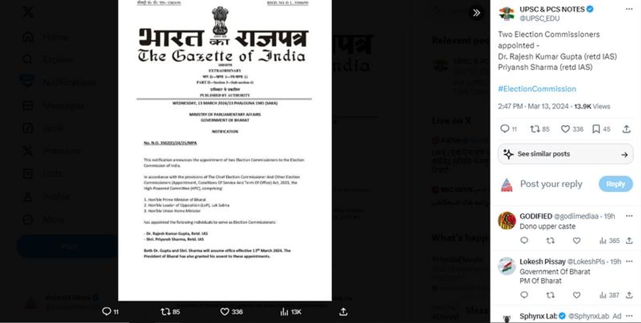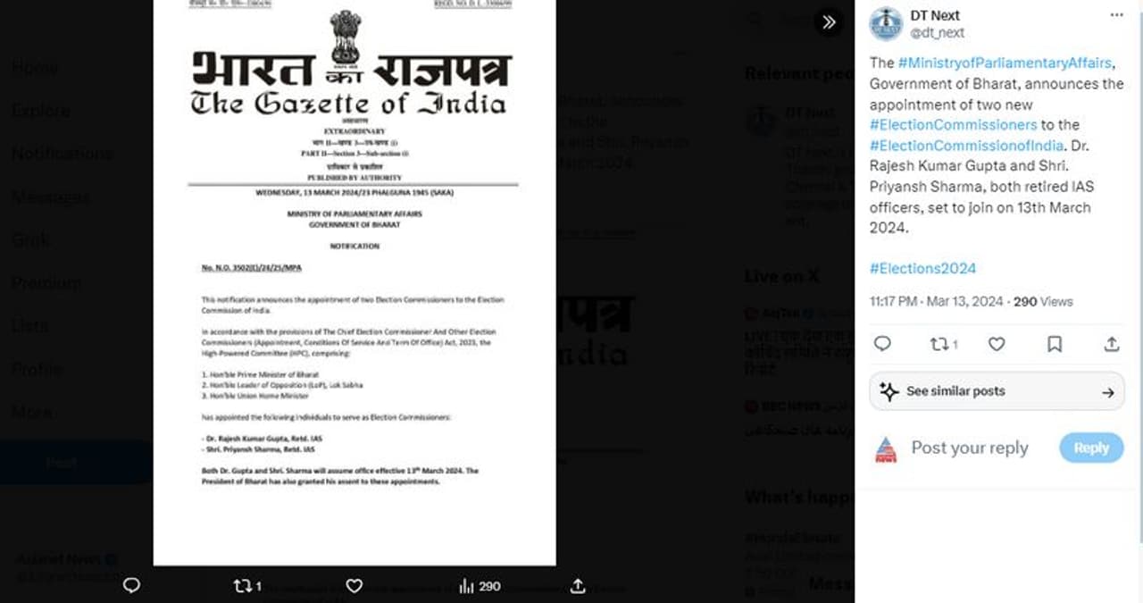 തെരഞ്ഞെടുപ്പ് കമ്മീഷണര്മാരുടെ നിയമനം സംബന്ധിച്ച വിജ്ഞാപനം എന്ന തലക്കെട്ടിലാണ് ഒരു നോട്ടിഫിക്കേഷന് പ്രചരിക്കുന്നത്. രാജേഷ് കുമാര് ഗുപ്ത, പ്രിയാന്ഷ് ശര്മ്മ എന്നിവരാണ് പുതിയ ഇലക്ഷന് കമ്മീഷണര്മാര് എന്ന് വിജ്ഞാപനത്തില് പറയുന്നു. ഇരുവരും വിരമിച്ച ഐഎഎസ് ഉദ്യോഗസ്ഥന്മാരാണ് എന്നും 2024 മാര്ച്ച് 13ന് ഇവര് ഓഫീസില് ചുമതലയേല്ക്കുമെന്നും രാഷ്ട്രപതി ഇരുവരുടെയും നിയമനം അംഗീകരിച്ചതായും വിജ്ഞാപനത്തില് വിശദീകരിക്കുന്നതായി കാണാം. നിരവധിയാളുകളാണ് എക്സില് (പഴയ ട്വിറ്റര്) വിജ്ഞാപനത്തിന്റെ പകര്പ്പ് പങ്കുവെച്ചത്.