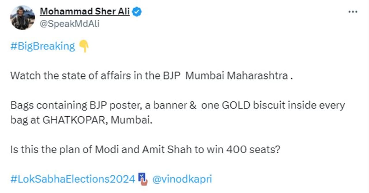 'ബിഗ് ബ്രേക്കിംഗ്. മഹാരാഷ്ട്രയിലെ മുംബൈയിലുള്ള ബിജെപിയുടെ പരിപാടികള് നോക്കുക. ബിജെപി പോസ്റ്ററും ബാനറും ഒരു ഗോള്ഡ് കോയിനും മുംബൈയിലെ ഘട്കോപാറില് വിതരണം ചെയ്യുന്ന എല്ലാ ബാഗുകളിലും അടങ്ങിയിരിക്കുന്നു. 400 സീറ്റുകള് നേടാനുള്ള നരേന്ദ്ര മോദിയുടെയും അമിത് ഷായുടേയും പദ്ധതി ഇതാണോ?'- എന്നുമുള്ള കുറിപ്പോടെയാണ് ഒര മിനുറ്റും 30 സെക്കന്ഡും ദൈര്ഘ്യമുള്ള വീഡിയോ ട്വീറ്റ് ചെയ്തിരിക്കുന്നത്. ബിജെപിയുടെ ചിഹ്നം ആലേഖനം ചെയ്തിട്ടുള്ള ഒരു സഞ്ചി തുറക്കുന്നതാണ് വീഡിയോയില് കാണുന്നത്. ഈ കിറ്റില് നിന്ന് എന്തൊക്കെയോ സാധനങ്ങള് പുറത്തെടുക്കുന്നതായി കാണാം.