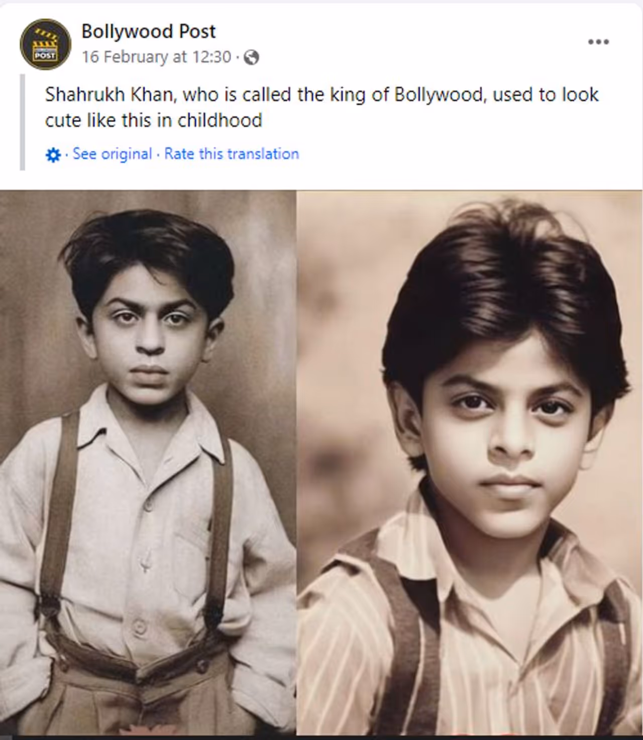 ഷാരൂഖ് ഖാന്റെ ബാല്യകാല ചിത്രങ്ങള് എന്ന കുറിപ്പോടെ ഫേസ്ബുക്കില് പ്രചരിക്കുന്ന ഫോട്ടോകള് എഐ സാങ്കേതിക വിദ്യയുടെ സഹായത്തോടെ സൃഷ്ടിച്ചവയാണ്.