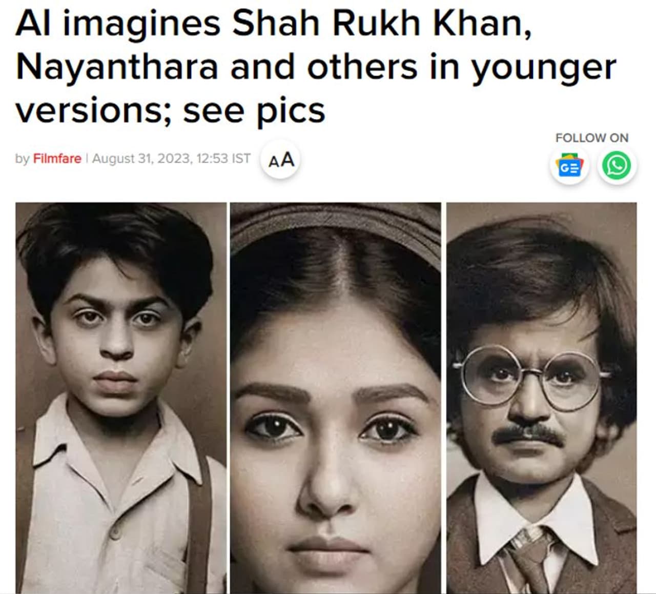 എന്നാല് ഷാരൂഖ് ഖാന്റെതായി പ്രചരിക്കുന്ന രണ്ട് ചിത്രങ്ങളും യഥാര്ഥമല്ല എന്നതാണ് സത്യം. എഐ (ആര്ട്ടിഫിഷ്യല് ഇന്റലിജന്സ്) സാങ്കേതിക വിദ്യയുടെ സഹായത്തോടെ നിര്മ്മിച്ച ഫോട്ടോകളാണിത്. ഷാരൂഖിന്റെ ലഭ്യമായ മറ്റ് കുട്ടിക്കാല ചിത്രങ്ങളുമായി ഇവയ്ക്ക് സാമ്യതകളില്ല എന്ന് ഒറ്റനോട്ടത്തില് തന്നെ വ്യക്തം. ഇപ്പോള് പ്രചരിക്കുന്ന എഐ ചിത്രങ്ങളില് ആദ്യത്തേത് 2023 ഓഗസ്റ്റ് 31ന് ഫിലിംഫെയര് ഡോട് കോമില് ഒരു ലേഖനത്തിനൊപ്പം പ്രസിദ്ധീകരിച്ചതാണ്. ഷാരൂഖിന്റെ എഐ ചിത്രമാണിത് എന്ന് ഈ ലേഖനത്തിന്റെ തലക്കെട്ടില് തന്നെ പറയുന്നു.
