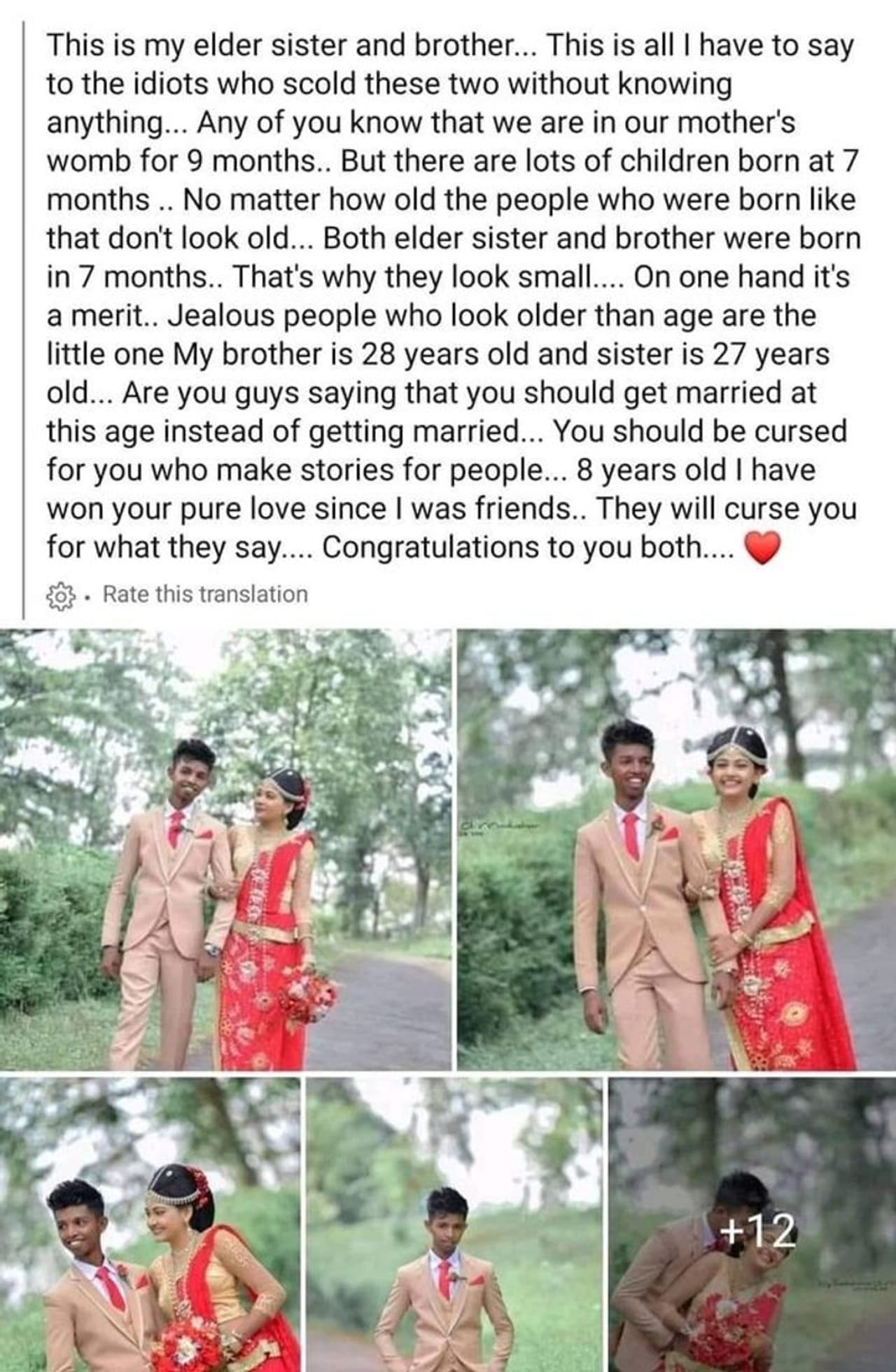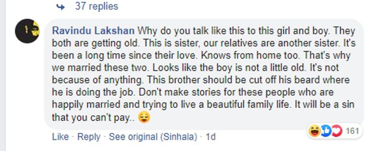 ഇതിനൊപ്പം പ്രചരിക്കുന്ന ഒരു കമന്റ് പ്രകാരം, സിംഹള ഭാഷയിലാണ് ഈ കമന്റ് , ഇത് ഇംഗ്ലീഷിലേക്ക് ഫേസ്ബുക്ക് തര്ജ്ജമ ചെയ്തപ്പോള് ചില പ്രശ്നങ്ങള് വന്നിട്ടുണ്ടെങ്കിലും. ഇത് പ്രകാരം ഇവര്ക്ക് ജന്മാന സംഭവിച്ച വളര്ച്ച വൈകല്യം ഉള്ളവരാണെന്നും. വരന് 28 വയസും, വധുവിന് 27 വയസും ഉണ്ടെന്ന് വ്യക്തമാണ്.