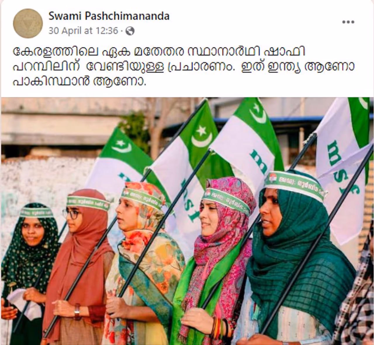 എംഎസ്എഫ് പതാക കയ്യിലേന്തിയ വനിതകളുടെ ചിത്രം സഹിതമാണ് ഒരു ഫേസ്ബുക്ക് ഗ്രൂപ്പില് പോസ്റ്റ് പ്രത്യക്ഷപ്പെട്ടത്. 'കേരളത്തിലെ ഏക മതേതര സ്ഥാനാര്ഥി ഷാഫി പറമ്പിലിന് വേണ്ടിയുള്ള പ്രചാരണം. ഇത് ഇന്ത്യ ആണോ പാകിസ്ഥാന് ആണോ' എന്ന ചോദ്യത്തോടെയാണ് ഫേസ്ബുക്ക് പോസ്റ്റ്.