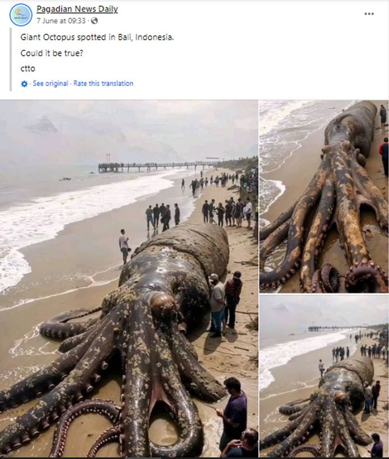 ബീച്ചില് കിടക്കുന്ന ഭീമന് നീരാളിയുടെ ചിത്രങ്ങളാണ് സാമൂഹ്യമാധ്യമമായ ഫേസ്ബുക്കില് 2024 ജൂണ് ഏഴാം തിയതി പോസ്റ്റ് ചെയ്തിരിക്കുന്നത്. ഇന്തോനേഷ്യയിലെ ബാലിയില് കണ്ടെത്തിയ ഭീമന് നീരാളി എന്ന തലക്കെട്ടിലാണ് ഫോട്ടോകള് പോസ്റ്റ് ചെയ്തിരിക്കുന്നത്. വലിയ നീലത്തിമിംഗലത്തിന്റെ വലിപ്പമുണ്ട് ഈ നീരാളിക്ക്. ഇത്ര വലിപ്പമുള്ള നീരാളിയെ കണ്ടതായി ആര്ക്കും മുന്പരിചയമില്ലാത്തതാണ് ചിത്രങ്ങളുടെ വസ്തുത പരിശോധിക്കാന് പ്രേരിപ്പിച്ച ഘടകം.