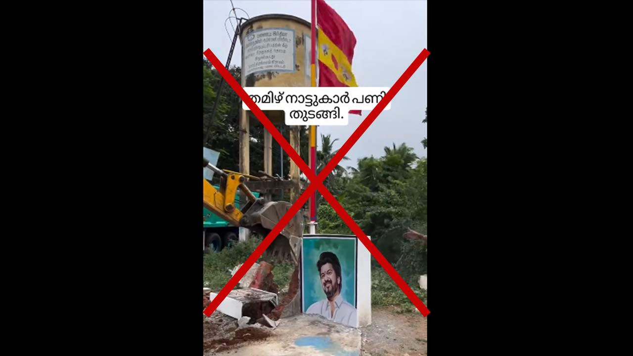 തിരുവനന്തപുരം: തമിഴ്നാട്ടിലെ കരൂരില് നടന് വിജയ്യുടെ തമിഴക വെട്രി കഴകം (ടിവികെ) പാര്ട്ടി 2025 സെപ്റ്റംബര് 27-ാം തീയതി സംഘടിപ്പിച്ച റാലിക്കിടെയുണ്ടായ തിക്കും തിരക്കും നിരവധി പേരുടെ മരണത്തിനിടയാക്കിയിരുന്നു. ഇതിന് പിന്നാലെ തമിഴ്നാട്ടില് വിജയ്യുടെ പാര്ട്ടിയുടെ കൊടിമരം ജെസിബി ഉപയോഗിച്ച് പിഴുതെറിഞ്ഞോ തമിഴ് മക്കള്. തമിഴ്നാട്ടുകാര് പണി തുടങ്ങി എന്ന തലക്കെട്ടില് പ്രചരിക്കുന്ന 18 സെക്കന്ഡ് വീഡിയോയുടെ വസ്തുത എന്താണ്? ഫാക്ട് ചെക്കില് വിശദമായി പരിശോധിക്കാം.