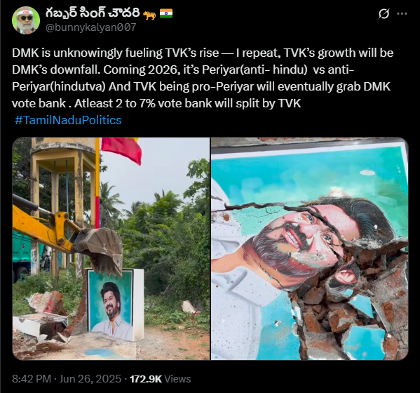 'ഹീറോ വെറും സീറോ ആണെന്ന് തമിഴ് ജനത്തിന് മനസ്സിലായോ.....?? തമിഴ് മക്കൾ സ്നേഹിച്ചാൽ നക്കികൊല്ലും. ഇടഞ്ഞു കഴിഞ്ഞാൽ JCB കൊണ്ട് കൊല്ലും'- എന്ന് മലയാളത്തിലുള്ള കുറിപ്പോടെയാണ് 18 സെക്കന്ഡ് വീഡിയോ ഫേസ്ബുക്കില് പോസ്റ്റ് ചെയ്തിരിക്കുന്നത്. നടന് വിജയ്യുടെ പാര്ട്ടിയായ തമിഴക വെട്രി കഴകത്തിന്റെ കൊടിമരം ജെസിബി ഉപയോഗിച്ച് പൊളിച്ചുനീക്കുന്നതാണ് വീഡിയോയില് കാണുന്നത്. കൊടിമരത്തില് വിജയ്യുടെ വലിയ ചിത്രവും കാണാം.