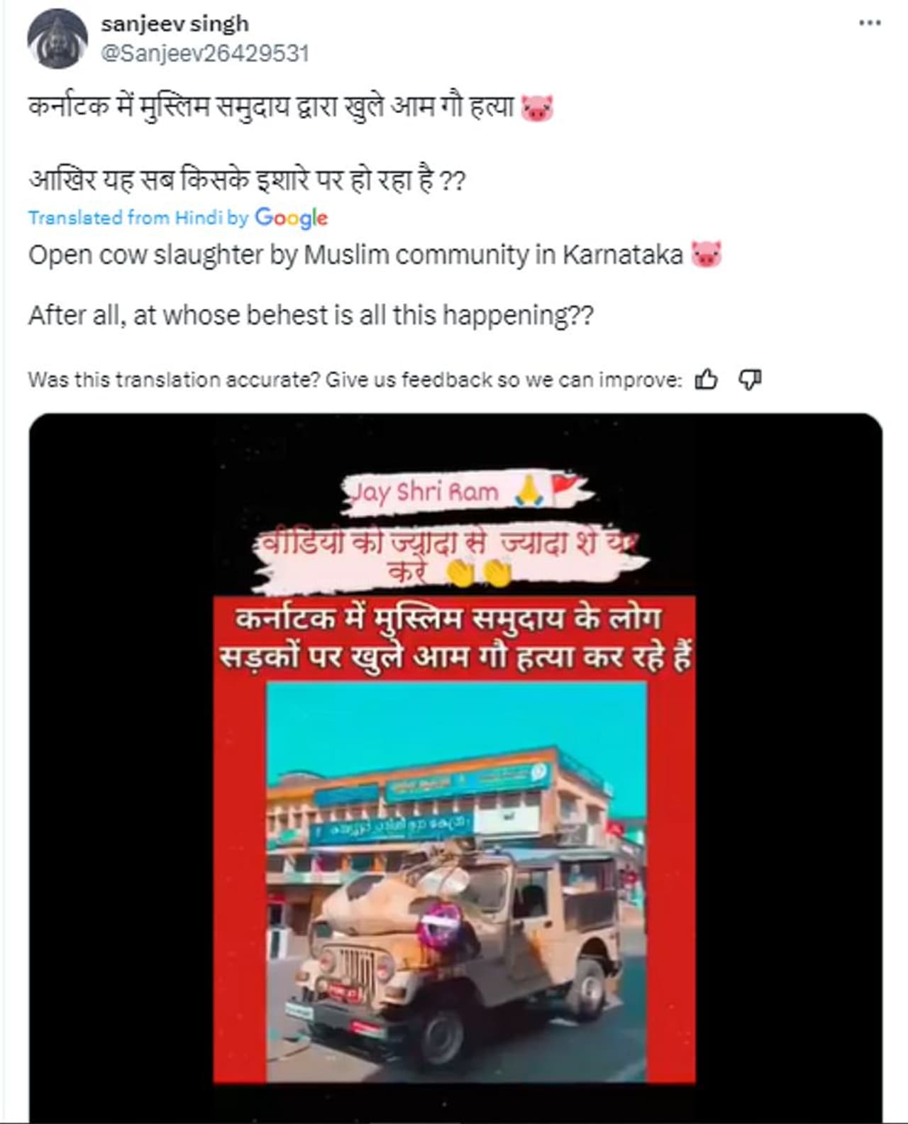 കര്ണാടകയില് മുസ്ലീംകള് പശുവിനെ പൊതുസ്ഥലത്ത് അറുത്തു എന്ന ആരോപണത്തോടെ ഒരു വീഡിയോ സാമൂഹ്യമാധ്യമമായ എക്സില് (പഴയ ട്വിറ്റര്) പ്രചരിക്കുകയാണ്. വര്ഗീയമായ ഈ ആരോപണത്തിന്റെ വസ്തുത എന്താണ്? സോഷ്യല് മീഡിയ പ്രചാരണത്തിന്റെ യാഥാര്ഥ്യം പരിശോധിക്കാം.