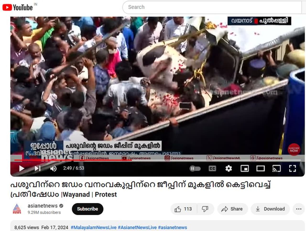 എക്സില് കാണുന്ന വീഡിയോയിലെ പോലെ ജീപ്പിന്റെ ബോണറ്റിന് മുകളില് പശുവിനെ കയറുകൊണ്ട് ആളുകള് കെട്ടിവയ്ക്കുന്നതും റീത്ത് സമര്പ്പിക്കുന്നതും ഏഷ്യാനെറ്റ് ന്യൂസ് 2024 ഫെബ്രുവരി 17ന് യൂട്യൂബില് അപ്ലോഡ് ചെയ്ത വീഡിയോ റിപ്പോര്ട്ടില് കാണാം. ഇരു ദൃശ്യങ്ങളും താരതമ്യം ചെയ്താല് പുല്പ്പള്ളി സംഭവത്തിന്റെ വ്യത്യസ്ത ആംഗിളുകളില് നിന്നുള്ള വീഡിയോകളാണിത് എന്ന് ഉറപ്പിക്കാം.