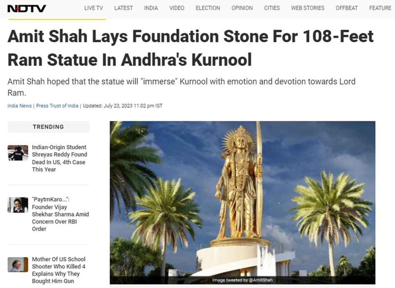 എന്നാല് സരയൂ നദിക്കരയില് വരുന്ന ശ്രീരാമ പ്രതിമയുടേത് എന്ന പേരില് പ്രചരിക്കുന്ന ചിത്രം യഥാര്ഥമോ എന്നറിയാന് ഫോട്ടോ റിവേഴ്സ് ഇമേജ് സെര്ച്ചിന് വിധേയമാക്കി. ഈ പരിശോധനയില് ദേശീയ മാധ്യമമായ എന്ഡിടിവിയുടെ ഒരു വാര്ത്ത ലഭിച്ചു. ആന്ധ്രാപ്രദേശിലെ കുര്ണൂലില് 108 അടി ഉയരമുള്ള ശ്രീരാമ പ്രതിമയുടെ ശിലാസ്ഥാപനം കേന്ദ്ര ആഭ്യന്തര മന്ത്രി അമിത് ഷാ നിര്വഹിച്ചു എന്നാണ് എന്ഡിടിവി 2023 ജൂലൈ 23ന് പ്രസിദ്ധീകരിച്ച വാര്ത്തയില് പറയുന്നത്. ആന്ധ്രയില് നിന്നുള്ള ഈ വാര്ത്തയില് ഇപ്പോള് സരയൂ നദിക്കരയിലേത് എന്ന തരത്തില് പ്രചരിക്കുന്ന ചിത്രം നല്കിയിട്ടുണ്ട് എന്ന് ചുവടെയുള്ള സ്ക്രീന്ഷോട്ടില് നിന്ന് മനസിലാക്കാം.