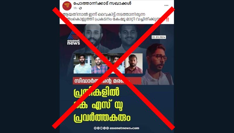 കൽപ്പറ്റ: പൂക്കോട് വെറ്റിനറി കോളേജിലെ സിദ്ധാർത്ഥന്റെ മരണവുമായി ബന്ധപ്പെട്ട് ഏഷ്യാനെറ്റ് ന്യൂസിന്റെ പേരില് വ്യാജ കാര്ഡ് പ്രചരിക്കുന്നു. സിദ്ധാർത്ഥന്റെ മരണത്തില് പ്രതികളായവരില് കെഎസ്യു പ്രവര്ത്തകരുമുണ്ട് എന്ന് ഏഷ്യാനെറ്റ് ന്യൂസ് വാര്ത്ത നല്കിയതായും കാര്ഡ് പങ്കുവെച്ചതായുമായാണ് സോഷ്യല് മീഡിയയിലെ പ്രചാരണം. എന്നാല് 'പ്രതികളില് കെഎസ്യു പ്രവര്ത്തകരും' എന്ന കുറിപ്പോടെ ഏഷ്യാനെറ്റ് ന്യൂസ് ഇത്തരമൊരു കാര്ഡ് സാമൂഹ്യമാധ്യമ അക്കൗണ്ടുകളില് ഒരിടത്തും പോസ്റ്റ് ചെയ്തിരുന്നില്ല എന്നതാണ് യാഥാര്ഥ്യം. ഏഷ്യാനെറ്റ് ന്യൂസ് ഇന്സ്റ്റഗ്രാമില് പങ്കുവെച്ച മറ്റൊരു കാര്ഡ് എഡിറ്റ് ചെയ്താണ് വ്യാജ കാര്ഡ് പ്രചരിപ്പിക്കുന്നത്.