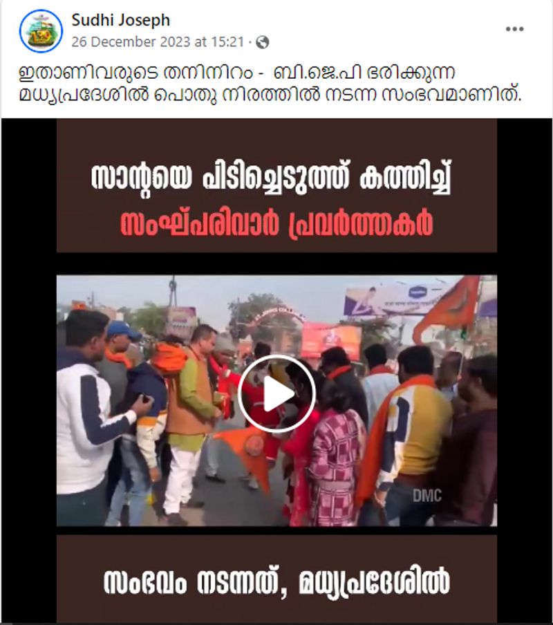 'ഇതാണിവരുടെ തനിനിറം - ബി.ജെ.പി ഭരിക്കുന്ന മധ്യപ്രദേശിൽ പൊതു നിരത്തിൽ നടന്ന സംഭവമാണിത്'- എന്ന കുറിപ്പോടെയാണ് സുധി ജോസഫ് എന്നയാള് 2023 ഡിസംബര് 26ന് വീഡിയോ ഫേസ്ബുക്കില് പോസ്റ്റ് ചെയ്തിരിക്കുന്നത്. ഒന്നര മിനുറ്റാണ് ഈ വീഡിയോയുടെ ദൈര്ഘ്യം. കുറച്ചുപേര് കൊടികളും കയ്യിലേന്തി മുദ്രാവാക്യം വിളിക്കുന്നതും ഒടുവില് സാന്റയെ റോഡിന് സമീപത്ത് വച്ച് ഇന്ധനമൊഴിച്ച് കത്തിക്കുന്നതും വീഡിയോയില് കാണാം. 'സാന്റയെ പിടിച്ചെടുത്ത് കത്തിച്ച് സംഘപരിവാര് പ്രവര്ത്തകര്, സംഭവം നടന്നത് മധ്യപ്രദേശില്' എന്ന വിവരണം ഈ വീഡിയോയില് കാണാം.