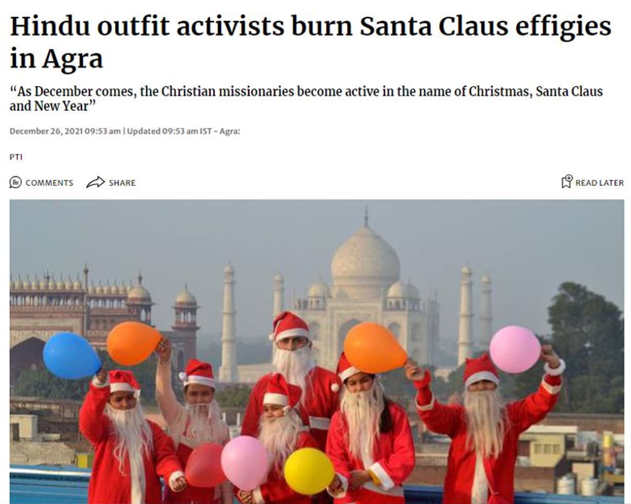 സംഭവം 2021ല് ആഗ്രയില് നടന്നത് തന്നയോ എന്നുറപ്പിക്കാന് കീവേഡ് സെര്ച്ച് നടത്തി. ഇതില് ദേശീയ മാധ്യമമായ ദി ഹിന്ദു പ്രമുഖ വാര്ത്താ ഏജന്സിയായ പിടിഐയെ ഉദ്ധരിച്ച് 2021 ഡിസംബര് 26ന് പ്രസിദ്ധീകരിച്ച ഒരു വാര്ത്ത ലഭിച്ചു. ആഗ്രയിൽ ഹിന്ദു സംഘടനാ പ്രവർത്തകർ സാന്താക്ലോസിന്റെ കോലം കത്തിച്ചു എന്ന തലക്കെട്ടിലാണ് ദി ഹിന്ദു വാര്ത്ത നല്കിയിരിക്കുന്നത്. ആഗ്ര നഗരത്തിലെ സെന്റ് ജോണ്സ് കോളേജിന് സമീപത്താണ് സാന്റയുടെ കോലം കത്തിച്ചത് എന്ന് വാര്ത്തയില് വിശദീകരിക്കുന്നു. എന്നാല് ഇപ്പോള് വൈറലായിരിക്കുന്ന വീഡിയോ ഈ വാര്ത്തയ്ക്കൊപ്പം ദി ഹിന്ദു പ്രസിദ്ധീകരിച്ചിട്ടില്ല.