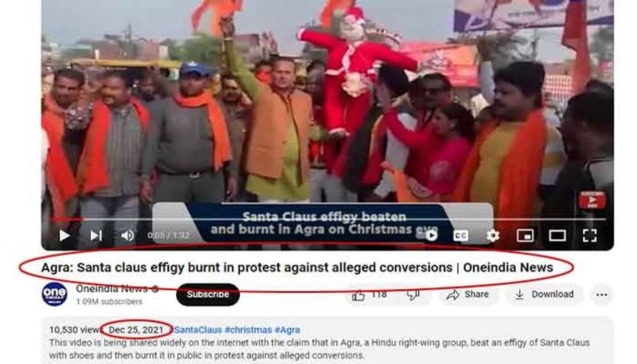 വീഡിയോയുടെ ഫ്രെയിമുകള് പരിശോധിച്ചുള്ള റിവേഴ്സ് ഇമേജ് സെര്ച്ചില് വണ്ഇന്ത്യ ന്യൂസ് 2021 ഡിസംബര് 25ന് വെരിഫൈഡ് യൂട്യൂബ് അക്കൗണ്ടില് പങ്കുവെച്ച ഒരു വീഡിയോ കണ്ടെത്താനായി. #SantaClaus #christmas #Agra എന്നീ ഹാഷ്ടാഗുകളോടെയാണ് വീഡിയോ പോസ്റ്റ് ചെയ്തിരിക്കുന്നത്. 'ആഗ്രയില് ഹിന്ദു വലതുപക്ഷ സംഘടന മതപരിവര്ത്തനത്തിനെതിരായ പ്രതിഷേധം എന്ന നിലയില് സാന്റയെ കത്തിക്കുന്നതിന്റെത് എന്ന അവകാശവാദത്തോടെ ഇന്റര്നെറ്റില് വ്യാപകമായി ഷെയര് ചെയ്യപ്പെടുന്ന വീഡിയോ'യാണിത് എന്ന് വണ്ഇന്ത്യ ന്യൂസ് യൂട്യൂബില് നല്കിയിട്ടുള്ള വിവരണത്തില് പറയുന്നു.