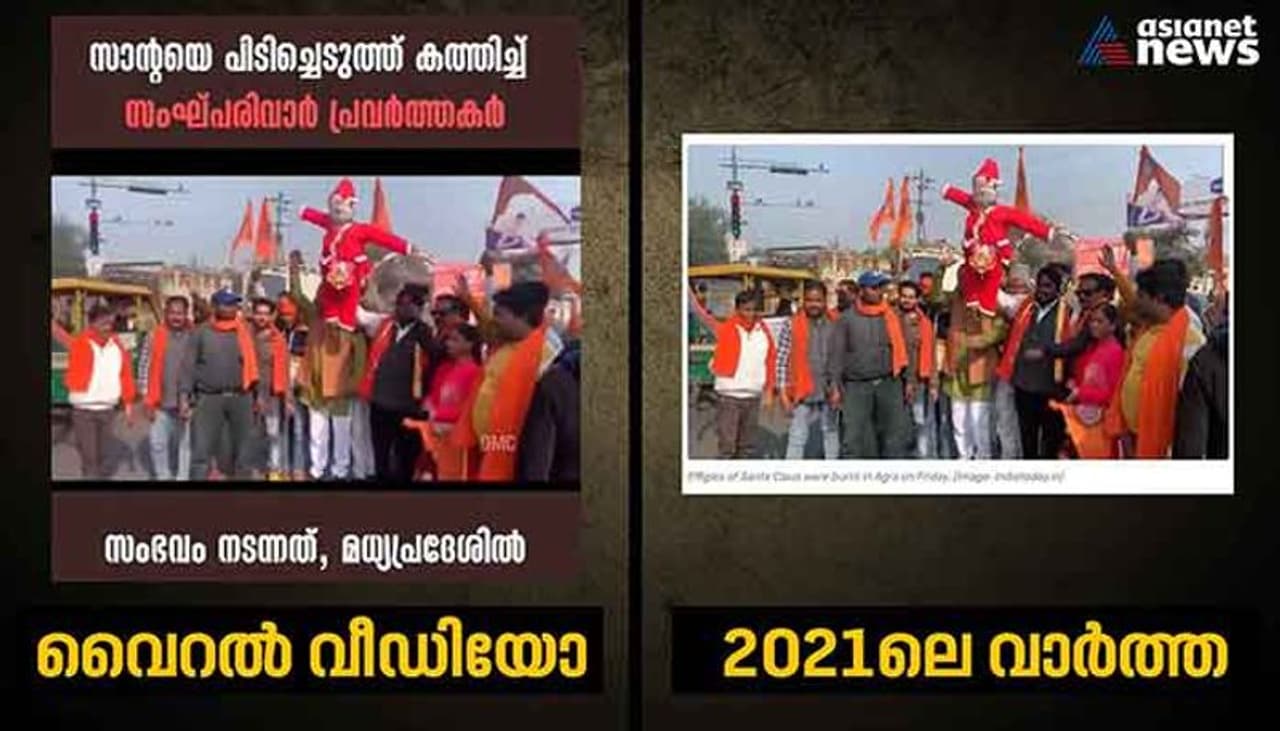 മധ്യപ്രദേശില് സാന്റാക്ലോസിനെ സംഘപരിവാര് പ്രവര്ത്തകര് കത്തിച്ചു എന്ന തരത്തില് സാമൂഹ്യമാധ്യമങ്ങളില് പ്രചരിക്കുന്ന വീഡിയോ ഉത്തര്പ്രദേശിലെ ആഗ്രയില് നിന്നുള്ളതും 2021ലേതുമാണ്.