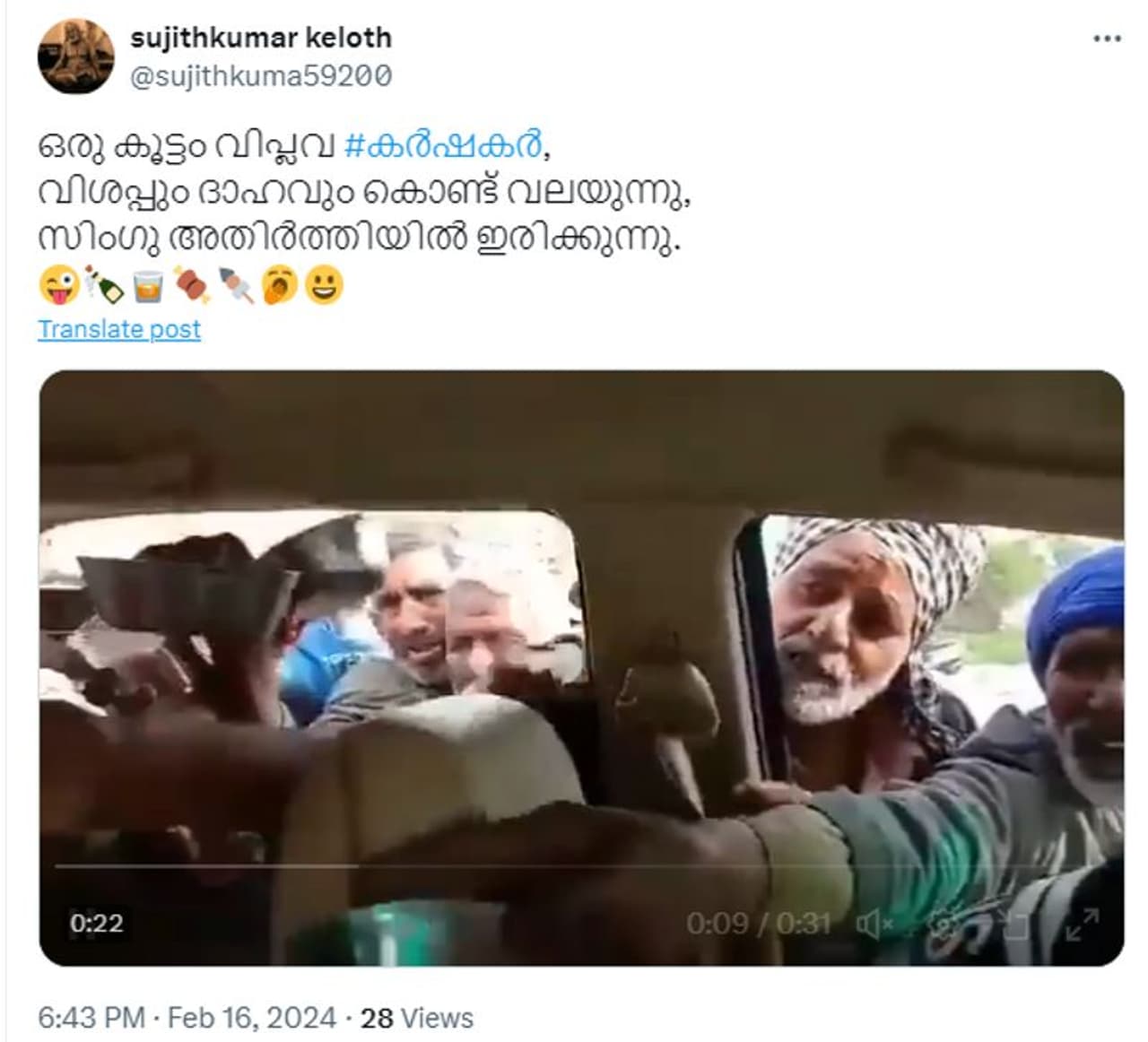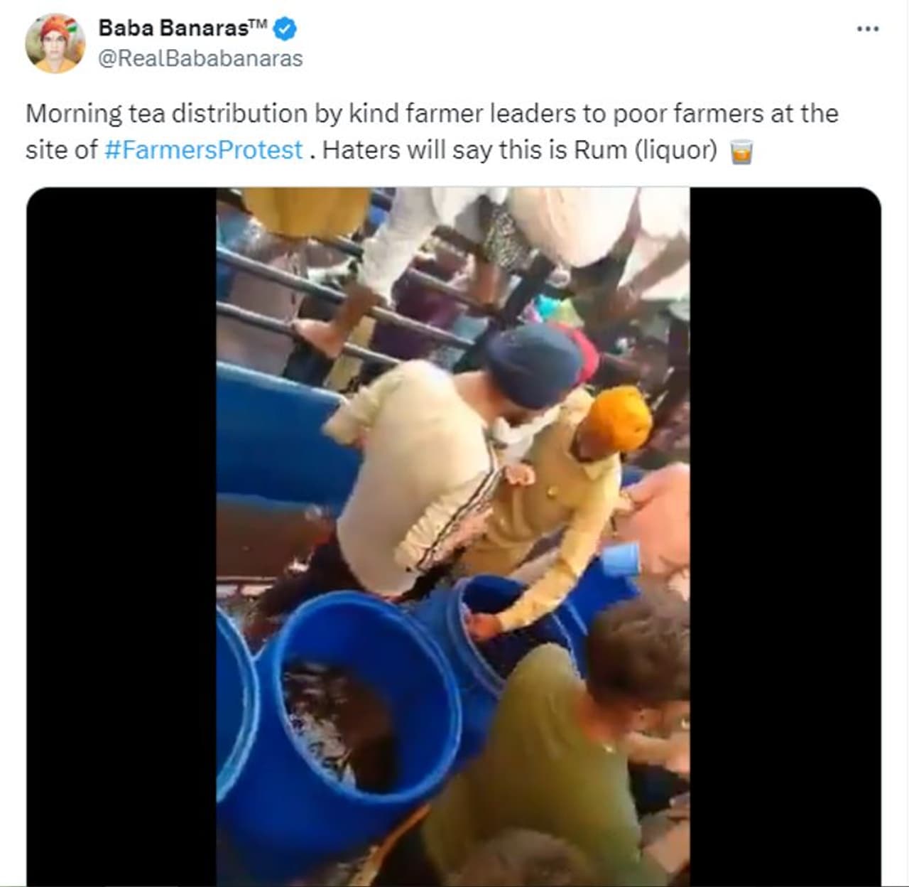 'കര്ഷക സമര സ്ഥലത്ത് രാവിലത്തെ ചായയായി മദ്യം വിതരണം ചെയ്യുന്നു, വിമര്ശകര് പറയും ഇത് റം ആണെന്ന്'- ഈ തലക്കെട്ടോടെയാണ് ബാബാ ബനാറസ് എന്ന വെരിഫൈഡ് എക്സ് ഹാന്ഡിലില് നിന്ന് 2024 ഫെബ്രുവരി 17ന് വീഡിയോ പ്രത്യക്ഷപ്പെട്ടിരിക്കുന്നത്. അറുപതിനായിരത്തിലേറെ ആളുകള് ഈ വീഡിയോ ഇതിനകം കണ്ടു. വലിയ ബാരലുകളില് നിറച്ചിരിക്കുന്ന മദ്യം വിതരണം ചെയ്യുന്നതും അത് വാങ്ങാന് ഗ്ലാസുമായി ആളുകള് തിക്കും തിരക്കും കൂട്ടുന്നതുമാണ് 23 സെക്കന്ഡ് ദൈര്ഘ്യമുള്ള വീഡിയോയില് കാണുന്നത്.
