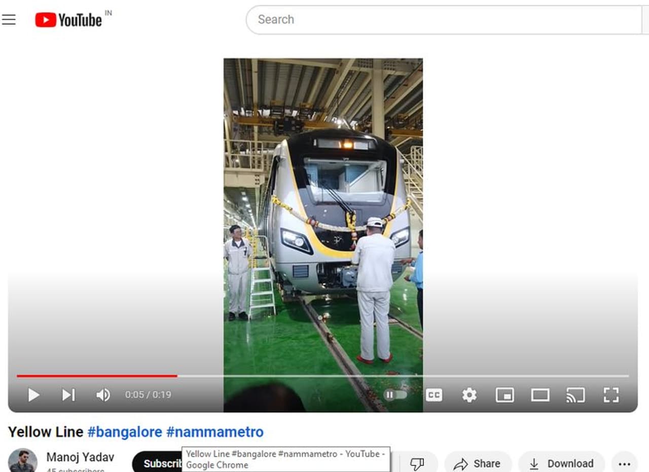 വീഡിയോയുടെ യാഥാര്ഥ്യം മനസിലാക്കാന് ദൃശ്യങ്ങളുടെ ഫ്രെയിമുകള് റിവേഴ്സ് ഇമേജ് സെര്ച്ചിന് വിധേയമാക്കുകയാണ് ആദ്യം ചെയ്തത്. പ്രചരിക്കുന്ന വീഡിയോ Yellow Line #bangalore #nammametro എന്ന തലക്കെട്ടില് യൂട്യൂബില് മനോജ് യാദവ് എന്ന യൂസര് 2024 മാര്ച്ച് എട്ടിന് പോസ്റ്റ് ചെയ്തിട്ടുള്ളതാണ് എന്ന് കാണാം. ബെംഗളൂരുവില് നിന്നുള്ള വീഡിയോയാണിത് എന്ന് മറ്റ് ചില യൂട്യൂബ് പോസ്റ്റുകളും ഇന്സ്റ്റഗ്രാം പോസ്റ്റുകളും അവകാശപ്പെടുന്നതായും മനസിലായി.