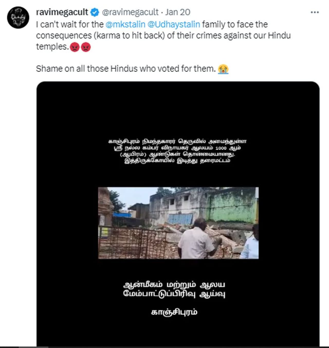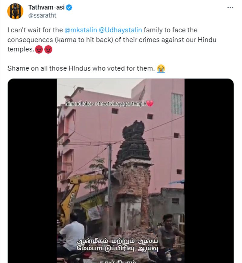 50 സെക്കന്ഡ് ദൈര്ഘ്യമുള്ള വീഡിയോയാണ് Tathvam-asi എന്ന വെരിഫൈഡ് എക്സ് യൂസര് 2024 ജനുവരി 18ന് പോസ്റ്റ് ചെയ്തിരിക്കുന്നത്. 'ഹിന്ദു ക്ഷേത്രങ്ങള്ക്കെതിരെ കുറ്റകൃത്യങ്ങള് ചെയ്യുന്ന എം കെ സ്റ്റാലിന്റെ കുടുംബം അതിന്റെ പ്രത്യാഘാതം അനുഭവിക്കുന്നത് കാണാന് കാത്തിരിക്കാനാവില്ല. ഡിഎംകെയ്ക്കായി വോട്ട് ചെയ്ത ഹിന്ദുക്കളെ ഓര്ത്ത് അപമാനം തോന്നുന്നു' എന്നുമാണ് വീഡിയോ പങ്കുവെച്ചുകൊണ്ട് Tathvam-asi കുറിച്ചിരിക്കുന്നത്. ട്വീറ്റില് തമിഴ്നാട് മുഖ്യമന്ത്രി എം കെ സ്റ്റാലിനെയും അദേഹത്തിന്റെ മകനും മന്ത്രിയുമായ ഉദയനിധിയെയും ടാഗ് ചെയ്തിട്ടുണ്ട്. ഇതിനകം നാല് ലക്ഷത്തിലധികം പേരാണ് ഈ വീഡിയോ കണ്ടത്.