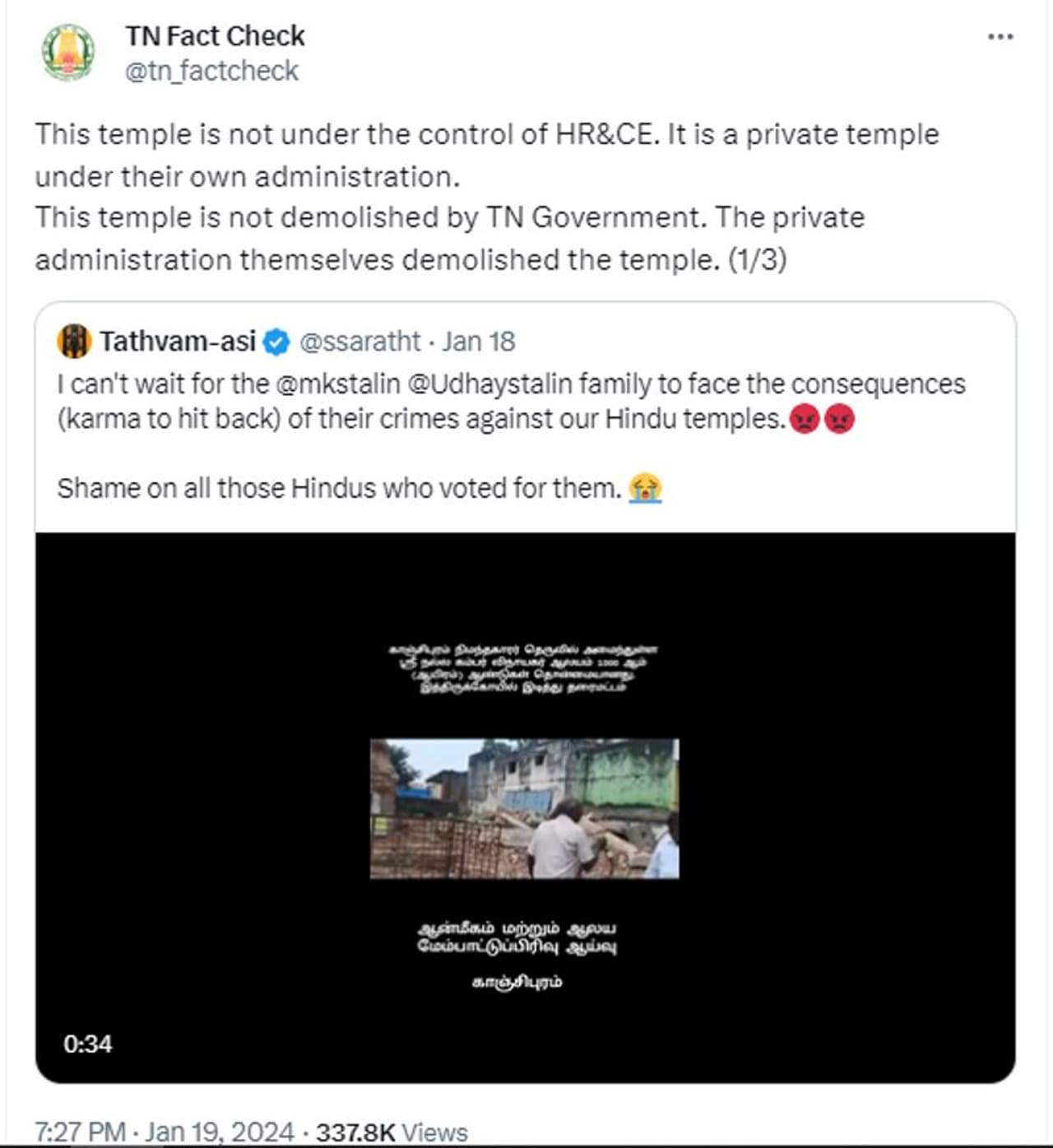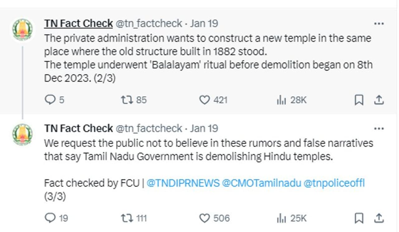 'പൊളിച്ചുമാറ്റപ്പെട്ട അമ്പലം തമിഴ്നാട് സര്ക്കാരിന് കീഴിലുള്ളതല്ല, ഒരു കുടുംബത്തിന്റെ കൈവശമുള്ള സ്വകാര്യ ക്ഷേത്രമാണിത്. അമ്പലം പൊളിച്ചത് തമിഴ്നാട് സര്ക്കാര് അല്ല. ക്ഷേത്രത്തിന്റെ സ്വകാര്യ ഉടമകള് തന്നെയാണ് അത് പൊളിച്ചത്. 1882ല് നിര്മിച്ച ക്ഷേത്രത്തിന് പകരം പുതിയത് നിര്മിക്കാന് വേണ്ടിയാണ് അതിന്റെ ഉടമകള് പൊളിച്ചുമാറ്റിയത്. തമിഴ്നാട് സര്ക്കാര് ക്ഷേത്രം പൊളിക്കുകയാണ് എന്ന അഭ്യൂഹങ്ങളും തെറ്റായ പ്രചാരണവും ആരും വിശ്വസിക്കരുത്' എന്നും തമിഴ്നാട് സര്ക്കാരിന്റെ ഫാക്ട് ചെക്ക് വിഭാഗം എക്സിലൂടെ അറിയിച്ചിട്ടുണ്ട് എന്ന് ചുവടെയുള്ള സ്ക്രീന്ഷോട്ടുകളില് കാണാം.