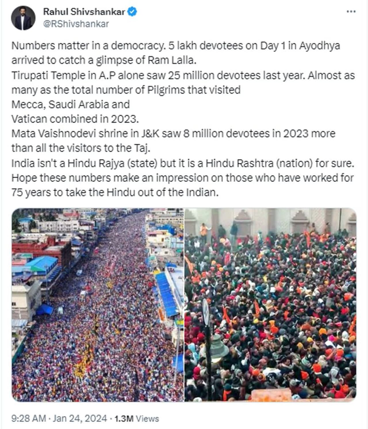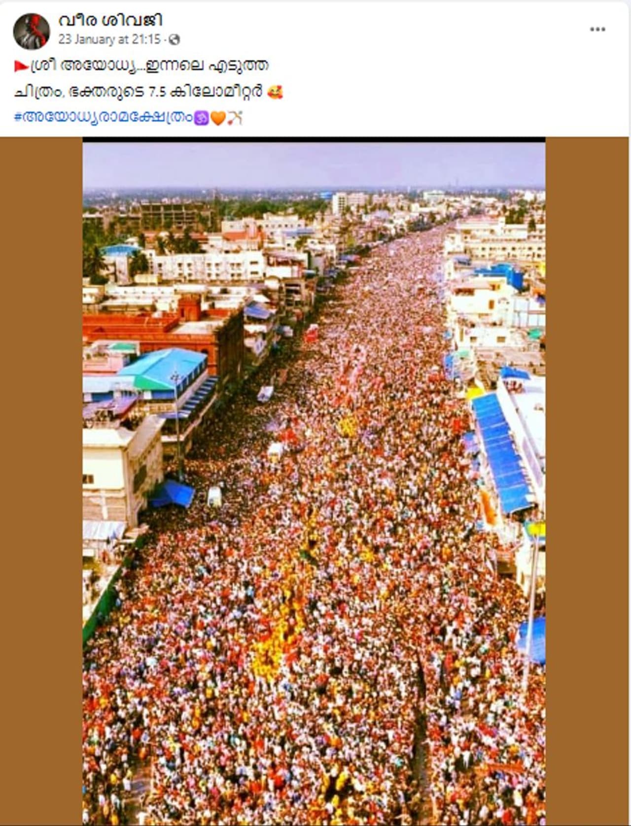 2024 ജനുവരി 22-ാം തിയതിയായിരുന്നു അയോധ്യയിലെ രാമക്ഷേത്ര പ്രതിഷ്ഠാ കര്മ്മം. ജനുവരി 24ന് മാധ്യമപ്രവര്ത്തകനായ രാഹുല് ശിവ്ശങ്കര് അയോധ്യയിലേത് എന്ന അവകാശവാദത്തോടെ രണ്ട് ചിത്രങ്ങള് സാമൂഹ്യമാധ്യമമായ എക്സില് പങ്കുവെച്ചു. അയോധ്യയിലെ ആദ്യ ദിനം അഞ്ച് ലക്ഷം ഭക്തര് എത്തി എന്ന അവകാശവാദത്തോടെയാണ് രാഹുല് ചിത്രങ്ങള് പങ്കുവെച്ചത്. ഇവയിലെ ആദ്യ ചിത്രമാണ് ആരുടെയും കണ്ണഞ്ചിപ്പിക്കും വിധം റോഡിലെ വലിയ ജനസഞ്ചയത്തിന്റെത്.