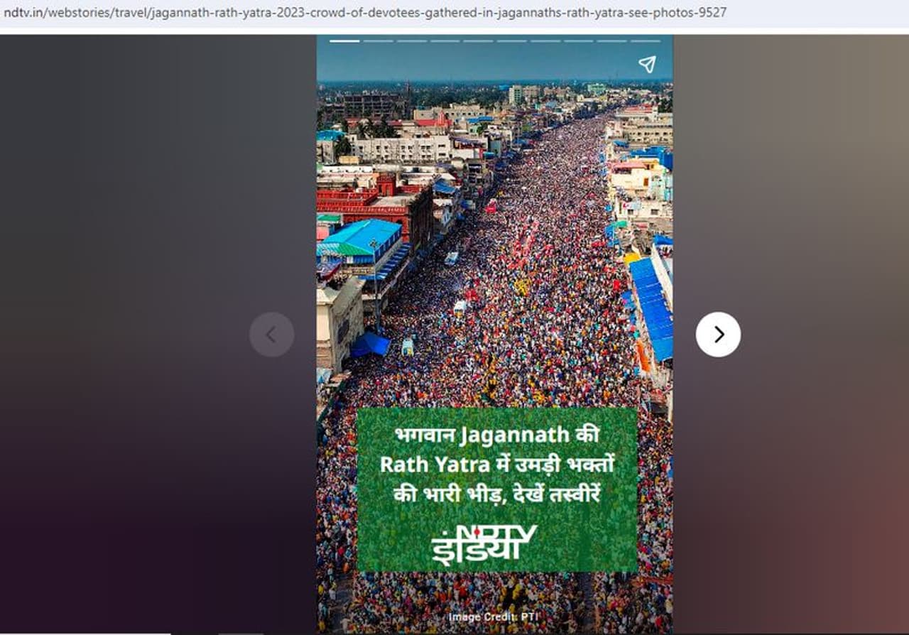 ഇതേ ചിത്രം അന്നേ ദിവസം ഇന്സ്റ്റഗ്രാം അടക്കമുള്ള സാമൂഹ്യമാധ്യമങ്ങളിലും പലരും പോസ്റ്റ് ചെയ്തിരുന്നു. ദേശീയ മാധ്യമമായ എന്ഡിടിവി പ്രസിദ്ധീകരിച്ച ഒരു വാര്ത്തയിലും സമാന ചിത്രം കാണാം. ജഗന്നാഥ രഥയാത്രയുടെ ചിത്രങ്ങള് എന്ന തലക്കെട്ടോടെയാണ് എന്ഡിടിവി ചിത്രം വാര്ത്തയാക്കിയിരിക്കുന്നത്.