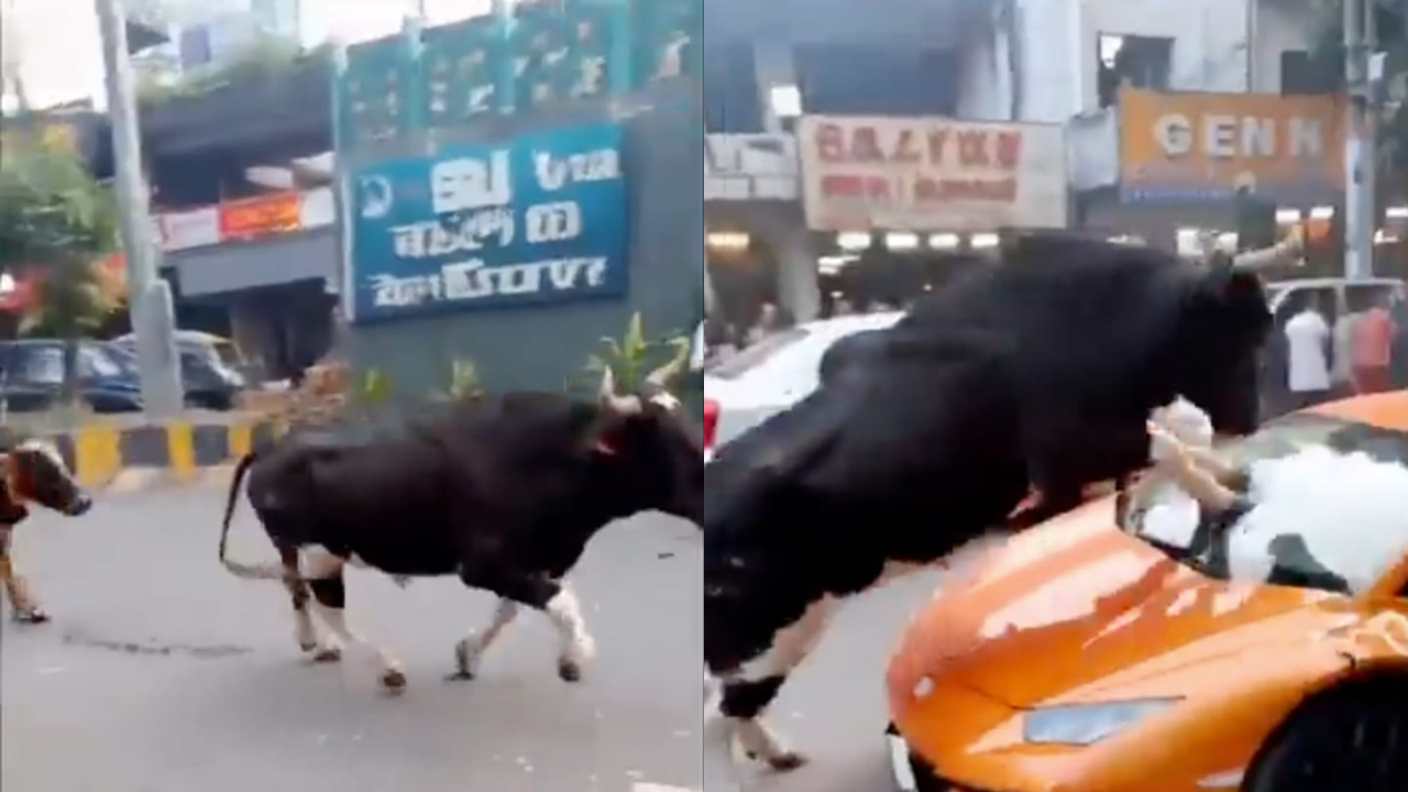 റോഡിലൂടെ പാഞ്ഞെത്തുകയാണ് കന്നുകാലികളുടെ ഒരു കൂട്ടം. ലംബോര്ഗിനിയോട് സാദൃശ്യമുള്ള ഒരു ഓറഞ്ച് കാറിന് മുകളിലൂടെ ഇതിലൊരു കാള ചാടിക്കടക്കുന്നു. കാറിന്റെ ബോണറ്റും ഫ്രണ്ട് ഗ്ലാസും ഈ ചാട്ടത്തില് തകരുന്നു. എക്സിലും ഇന്സ്റ്റഗ്രാമിലും ഫേസ്ബുക്കിലും നിരവധിയാളുകളാണ് ഈ വീഡിയോ പങ്കുവെച്ചിരിക്കുന്നത്.