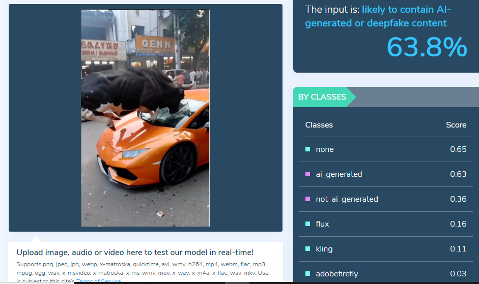 ഒരു ആഢംബര കാറിന് മുകളിലൂടെ ചവിട്ടിക്കടന്നുപോകുന്ന കാളയുടെ വീഡിയോ യഥാര്ഥമല്ല, എഐ നിര്മ്മിതമാണ്.