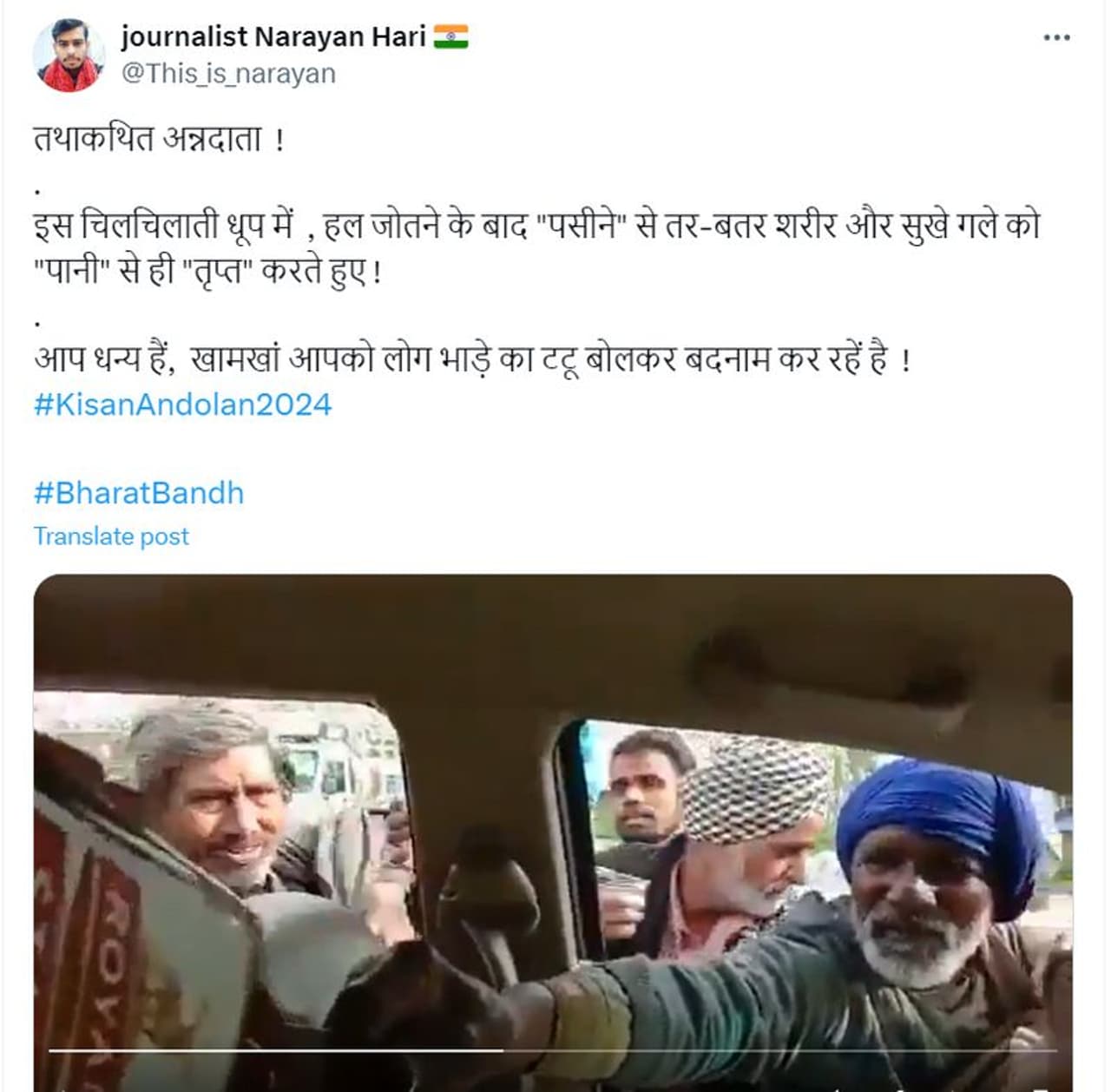 31 സെക്കന്ഡ് ദൈർഘ്യമുളള വീഡിയോയാണ് എക്സില് (പഴയ ട്വിറ്റർ) പ്രചരിക്കുന്നത്. ഒരു വാഹനത്തില് നിന്ന് പുറത്തുനില്ക്കുന്ന ആളുകള്ക്ക് മദ്യം ഒഴിച്ചുകൊടുക്കുന്നതാണ് വീഡിയോയില് കാണുന്നത്. കർഷക സമരത്തിനെത്തിയ കർഷകരുടെ കാഴ്ചയാണിത് എന്ന അവകാശവാദത്തോടെയാണ് വീഡിയോ 2024 ഫെബ്രുവരി 16ന് journalist Narayan Hari എന്ന വ്യക്തി പോസ്റ്റ് ചെയ്തിരിക്കുന്നത്. ആയിരക്കണക്കിന് പേർ ഇതിനകം വീഡിയോ കണ്ടുകഴിഞ്ഞു. മദ്യം വാങ്ങാനായി തിക്കുംതിരക്കും കൂട്ടുന്നവരില് വൃദ്ധരും യുവാക്കളുമുണ്ട്. എന്നാല് മദ്യം വിതരണം ചെയ്യുന്ന ആളിന്റെ മുഖം വ്യക്തമല്ല. കർഷക സമരവും ഭാരത് ബന്ദുമായി ബന്ധപ്പെട്ട ഹാഷ്ടാഗുകള് ട്വീറ്റില് കാണാം.
