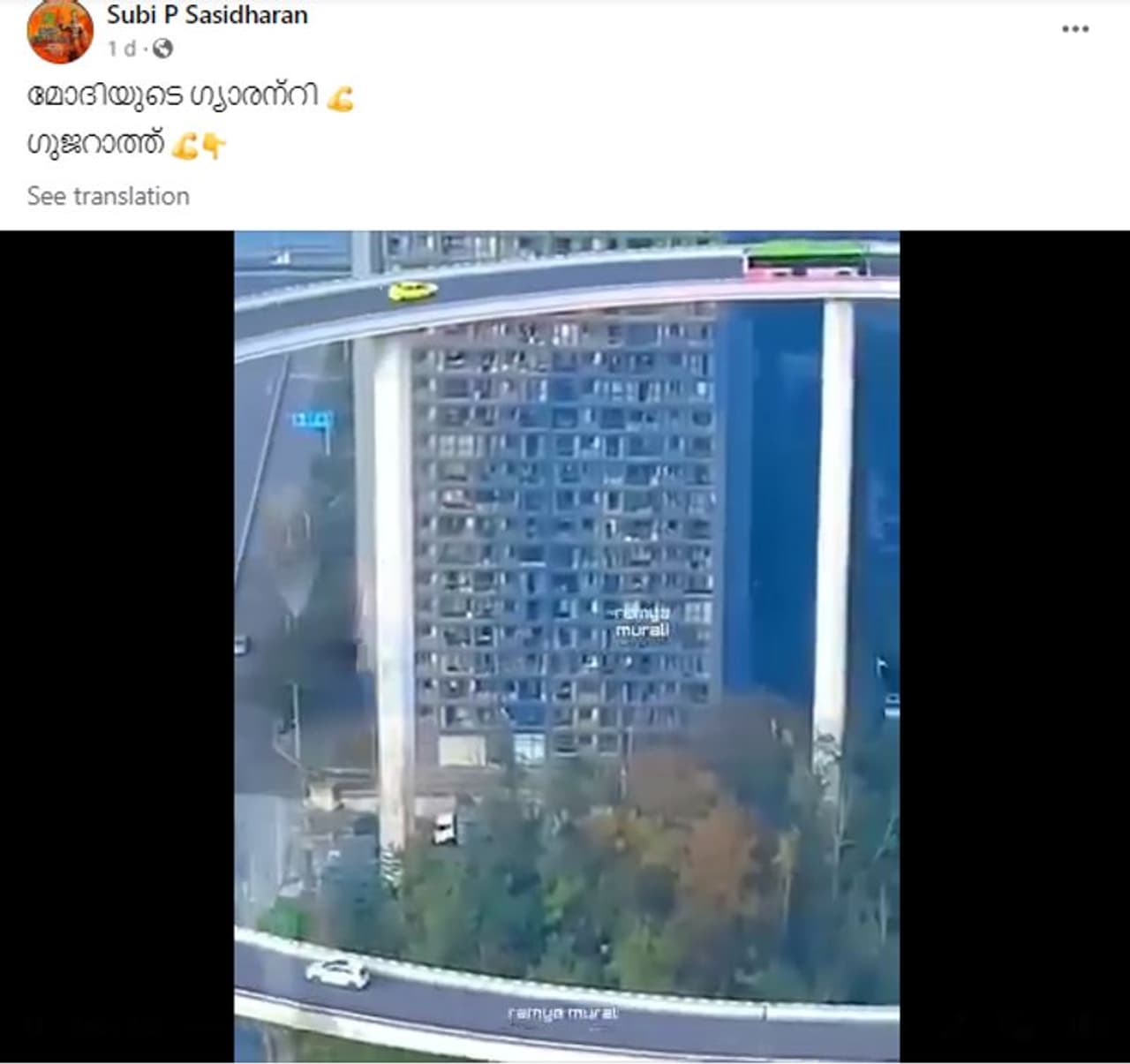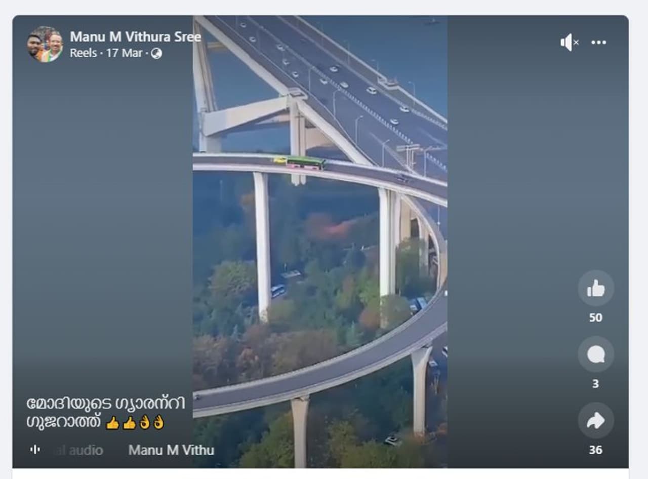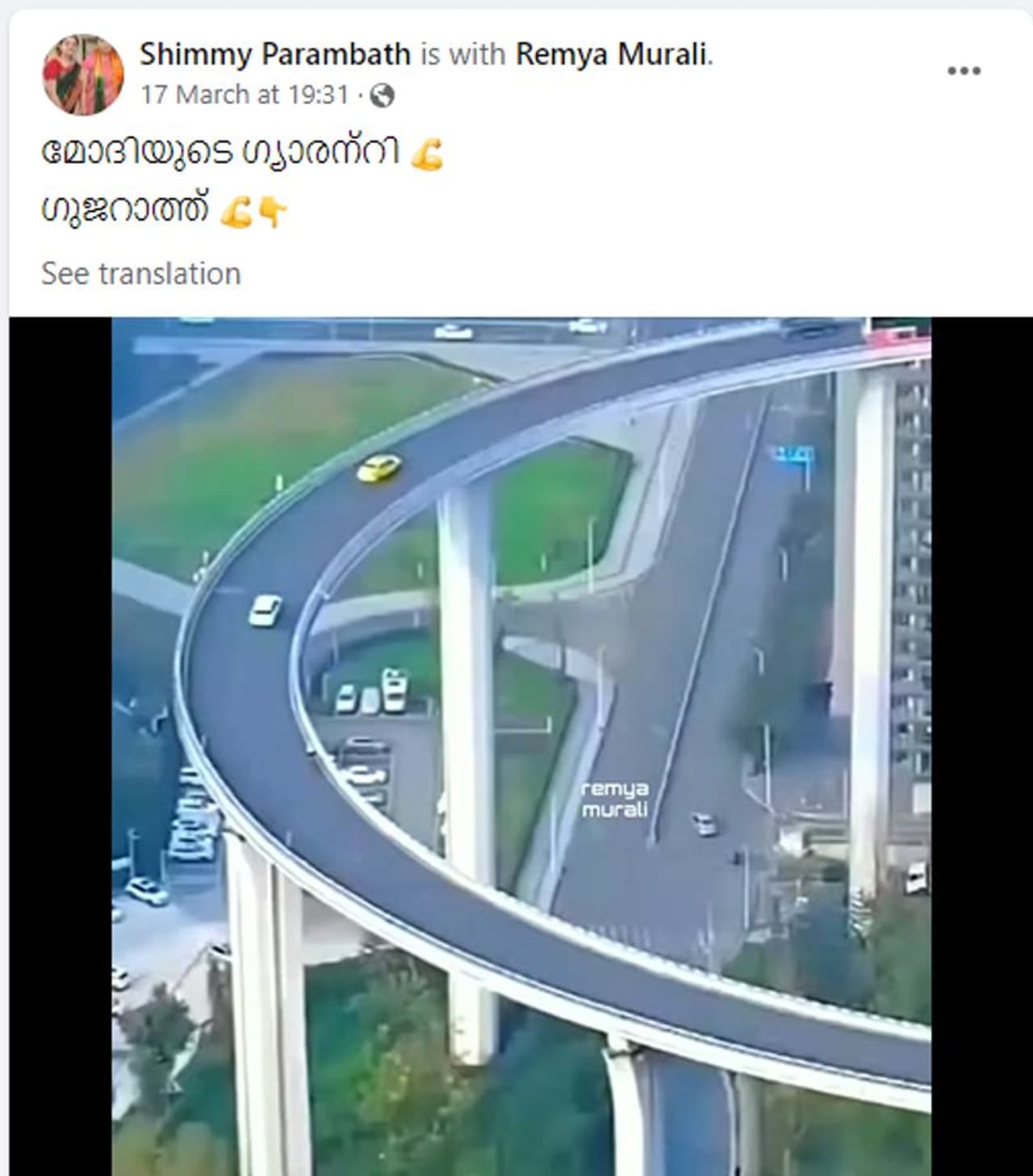 ഷിമ്മി പറമ്പത്ത് എന്ന യൂസര് ഫേസ്ബുക്കില് 2024 മാര്ച്ച് 17ന് വീഡിയോ പോസ്റ്റ് ചെയ്തത് ചുവടെ കൊടുക്കുന്നു. 'മോദിയുടെ ഗ്യാരണ്ടി, ഗുജറാത്ത്' എന്ന തലക്കെട്ടിലാണ് 20 സെക്കന്ഡ് ദൈര്ഘ്യമുള്ള വീഡിയോ പോസ്റ്റ് ചെയ്തിരിക്കുന്നത്. മറ്റ് നിരവധിയാളുകളും സമാന വീഡിയോ പോസ്റ്റ് ചെയ്തിട്ടുണ്ട്. ഏറെ മേല്പാലങ്ങളോടെയുള്ള ഈ റോഡ് നെറ്റ്വര്ക്ക് നിര്മിച്ചത് നരേന്ദ്ര മോദിയാണ് എന്ന് വീഡിയോ പങ്കുവെക്കുന്നവര് അവകാശപ്പെടുന്നു. ഇതിനായി മോദിയുടെ ചിത്രവും തലക്കെട്ടിന് പുറമെ വീഡിയോയ്ക്കൊപ്പം ചേര്ത്തിട്ടുണ്ട്.
