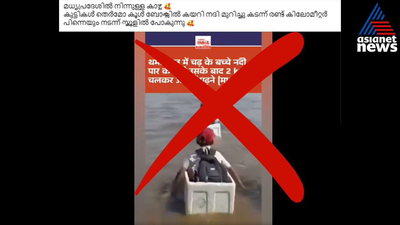 ഫേസ്ബുക്കില് 'വേടത്തി' എന്ന അക്കൗണ്ടില് പങ്കുവെച്ചിരിക്കുന്ന 15 സെക്കന്ഡ് ദൈര്ഘ്യമുള്ള വീഡിയോയ്ക്ക് ഒപ്പമുള്ള വിവരണം ഇങ്ങനെ... 'മധ്യപ്രദേശില് നിന്നുള്ള കാഴ്ച. കുട്ടികള് തെര്മോകോള് ബോക്സില് കയറി നദി മുറിച്ചു കടന്ന്, രണ്ട് കിലോമീറ്റര് പിന്നെയും നടന്ന് സ്കൂളില് പോകുന്നു'. സ്കൂള് ബാഗ് ചുമലിലേന്തിയ, സ്കൂള് യൂണിഫോം അണിഞ്ഞ കുഞ്ഞു വിദ്യാര്ഥികള് തെര്മോകോള് ബോക്സ് ചങ്ങാടമാക്കി തുഴഞ്ഞ് മറുകരയിലേക്ക് പോകുന്നത് ദൃശ്യങ്ങളില് കാണാം.