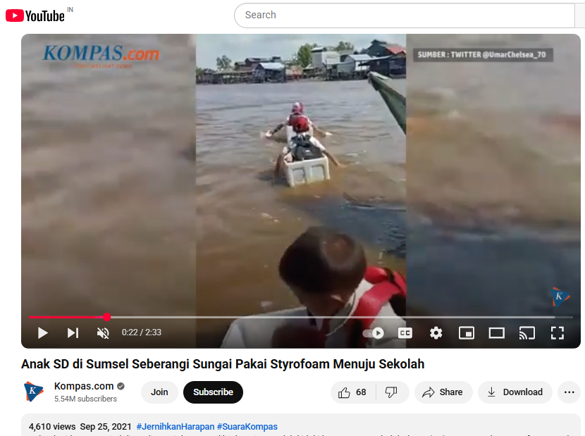 മധ്യപ്രദേശില് വലിയ ജലാശയത്തിലൂടെ തെര്മോകോള് ബോക്സ് ചങ്ങാടമാക്കി തുഴഞ്ഞ് സാഹസികമായി വിദ്യാര്ഥികള് സ്കൂളില് പോകുന്നതായുള്ള വീഡിയോ പ്രചാരണം തെറ്റിദ്ധരിപ്പിക്കുന്നതാണ്. യഥാര്ഥത്തില് ഈ സംഭവം നടന്നത് ഇന്തോനേഷ്യയിലെ തെക്കന് സുമാത്ര പ്രവിശ്യയിലാണ്. 2021ലാണ് ഈ സംഭവം നടന്നത്.