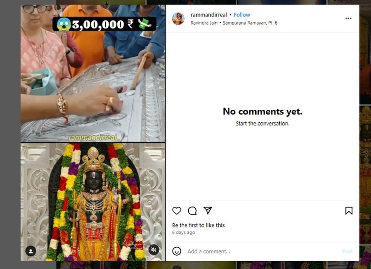 അയോധ്യ ശ്രീരാമക്ഷേത്രത്തില് നോട്ടുകെട്ടുകള് ഭക്തര് സമര്പ്പിക്കുന്നതായി അവകാശപ്പെടുന്ന വീഡിയോയാണ് സാമൂഹ്യമാധ്യമമായ ഇന്സ്റ്റഗ്രാമില് കാണുന്നത്. 2024 ഫെബ്രുവരി ഏഴാം തിയതി rammandirreal എന്ന ഇന്സ്റ്റ അക്കൗണ്ടില് നിന്ന് പോസ്റ്റ് ചെയ്ത വീഡിയോ ഇതിനകം ഒരു ലക്ഷത്തിലധികം പേര് കണ്ടുകഴിഞ്ഞു. ഒരു സഞ്ചിയില് നിന്നെടുക്കുന്ന നോട്ടുകെട്ടുകള് രണ്ട് സ്ത്രീ ഭക്തര് ചേര്ന്ന് ഭണ്ഡാരത്തില് ഇടുന്നതാണ് വീഡിയോയില് കാണുന്നത്. മൂന്ന് ലക്ഷം രൂപയാണ് ഇവര് നിക്ഷേപിച്ച് എന്ന് വീഡിയോയില് എഴുതിയിരിക്കുന്നതായി കാണാം.
