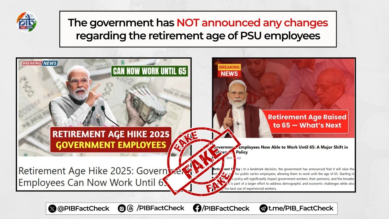 എന്നാല് പെന്ഷന് പ്രായം ഉയര്ത്തിയെന്ന തരത്തിലുള്ള റിപ്പോര്ട്ടുകള് നിഷേധിക്കുകയാണ് പ്രസ് ഇന്ഫര്മേഷന് ബ്യൂറോയുടെ ഫാക്ട് ചെക്ക് വിഭാഗം. വിരമിക്കല് പ്രായം ഉയര്ത്തുന്നത് സംബന്ധിച്ച് യാതൊരു പ്രഖ്യാപനവും കേന്ദ്രം നടത്തിയിട്ടില്ലെന്ന് പിഐബി ഫാക്ട് ചെക്ക് അറിയിച്ചു. ഇത്തരത്തിലുള്ള വിവരങ്ങള് പങ്കുവെക്കുമ്പോള് എപ്പോഴും വെരിഫൈ ചെയ്യണമെന്നും പിഐബിയുടെ ഫാക്ട് ചെക്ക് വിഭാഗം അഭ്യര്ഥിച്ചു.