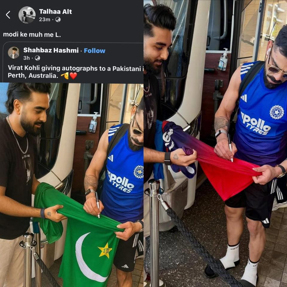 എന്നാല് വിരാട് കോലിയുടെ ചിത്രത്തിന്റെ വസ്തുത മറ്റൊന്നാണ്. കോലി തന്റെ ഐപിഎല് ടീമായ റോയല് ചലഞ്ചേഴ്സ് ബെംഗളൂരുവിന്റെ ജേഴ്സിയില് ഓട്ടോഗ്രാഫ് നല്കുന്നതിന്റെ ചിത്രം എഡിറ്റ് ചെയ്ത് നിറംമാറ്റം വരുത്തിയാണ് ഈ പാക് പ്രചാരണം നടക്കുന്നത് എന്നതാണ് വസ്തുത. കോലി പാകിസ്ഥാന് ജേഴ്സിയില് ഓട്ടോഗ്രാഫ് നല്കുന്നൊരു സംഭവമുണ്ടായിട്ടില്ല.
