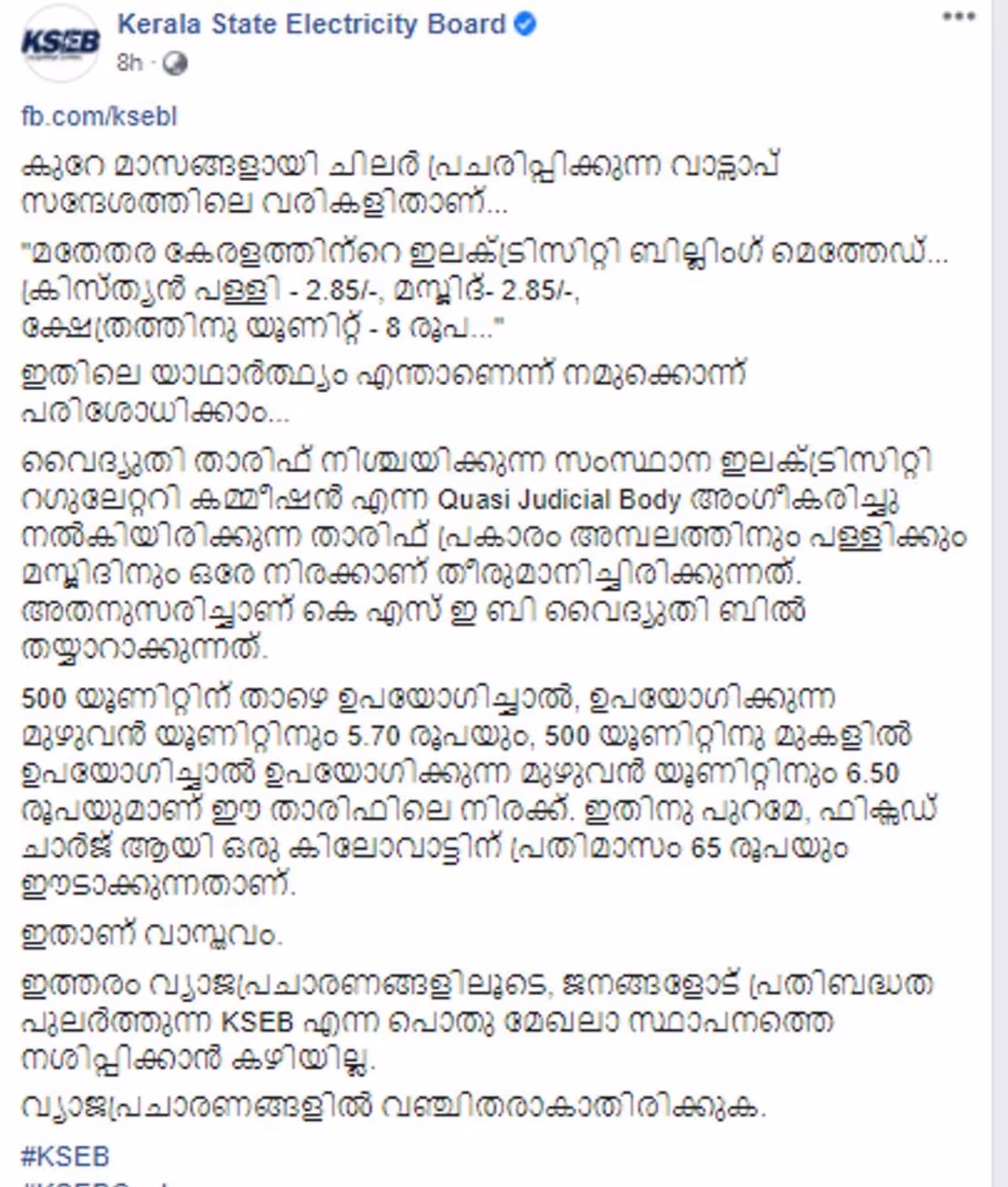 മാസങ്ങളായി വാട്സ്ആപ്പിലൂടെ മതേതര കേരളത്തിന്റെ ഇലക്ട്രിസിറ്റി ബില്ലിംഗ് മെത്തേഡ് എന്ന പേരിൽ പ്രചരിക്കുന്ന സന്ദേശം വസ്തുതാ വിരുദ്ധമാണ്. വൈദ്യുതി താരിഫ് നിശ്ചയിക്കുന്ന സംസ്ഥാന ഇലക്ട്രിസിറ്റി റഗുലേറ്ററി കമ്മീഷൻ എന്ന Quasi Judicial Body അംഗീകരിച്ചു നൽകിയിരിക്കുന്ന താരിഫ് പ്രകാരം ക്ഷേത്രത്തിനും പള്ളിക്കും മസ്ജിദിനും ഒരേ നിരക്കാണ്.