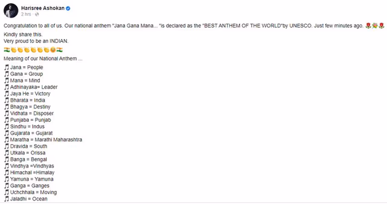 കൊച്ചി: ഇന്ത്യയുടെ ദേശീയഗാനം ലോകത്തെ ഏറ്റവും മികച്ചതായി യുനസ്കോ (UNESCO) തെരഞ്ഞെടുത്തു എന്ന വ്യാജ സന്ദേശം (False Claim) ഫേസ്ബുക്കില് പങ്കുവെച്ച് ചലച്ചിത്ര നടന് ഹരിശ്രീ അശോകന് (Harisree Ashokan). ഒരു പതിറ്റാണ്ടിലേറെ പഴക്കമുള്ള വ്യാജ പ്രചാരണമാണ് ഹരിശ്രീ അശോകന് ഷെയര് ചെയ്ത് പുലിവാല് പിടിച്ചത്. പോസ്റ്റിന് താഴെ നടനെ തിരുത്തി നിരവധി പേര് രംഗത്തെത്തി.