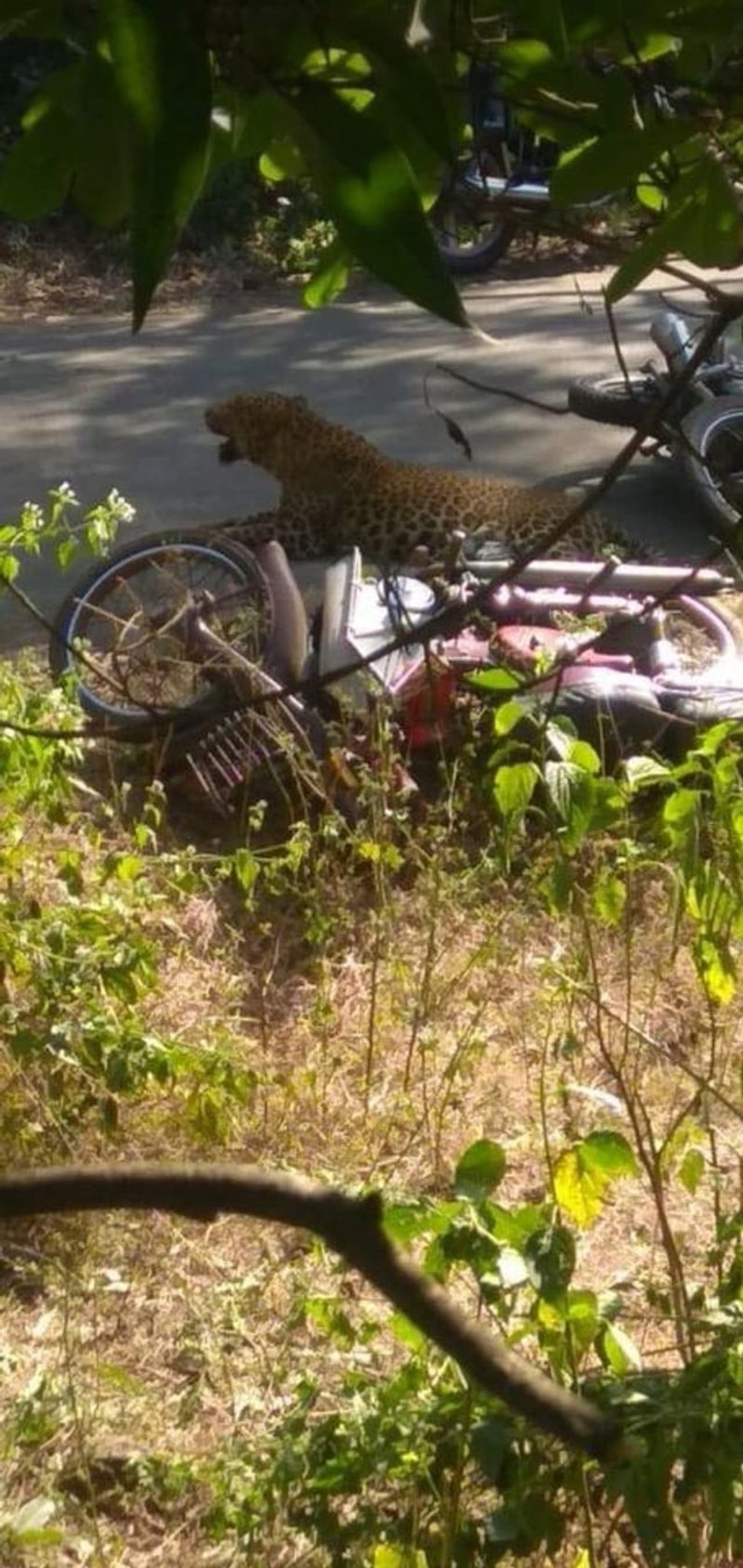 പുള്ളിപ്പുലിയുടെ ആക്രമണത്തിന്റേതായി ഒരുപിടി ചിത്രങ്ങളാണ് പ്രചരിക്കുന്നത്. പുള്ളിപ്പുലി കറങ്ങിനടക്കുന്നതിന്റെയും ആളുകള് പ്രാണരക്ഷാര്ഥം മരത്തില് കയറിയിരിക്കുന്നതുമാണ് ചിത്രങ്ങളിലുള്ളത്. സമീപത്ത് മറിഞ്ഞുകിടക്കുന്ന ബൈക്കും മുഖത്ത് ഗുരുതരമായി പരിക്കേറ്റ ഒരാളുടേയും ചിത്രവും ഇതിലുണ്ട്. ശ്രീശൈലം റോഡിലാണ് സംഭവം എന്നാണ് ഫേസ്ബുക്ക് പോസ്റ്റുകളില് പറയുന്നത്.