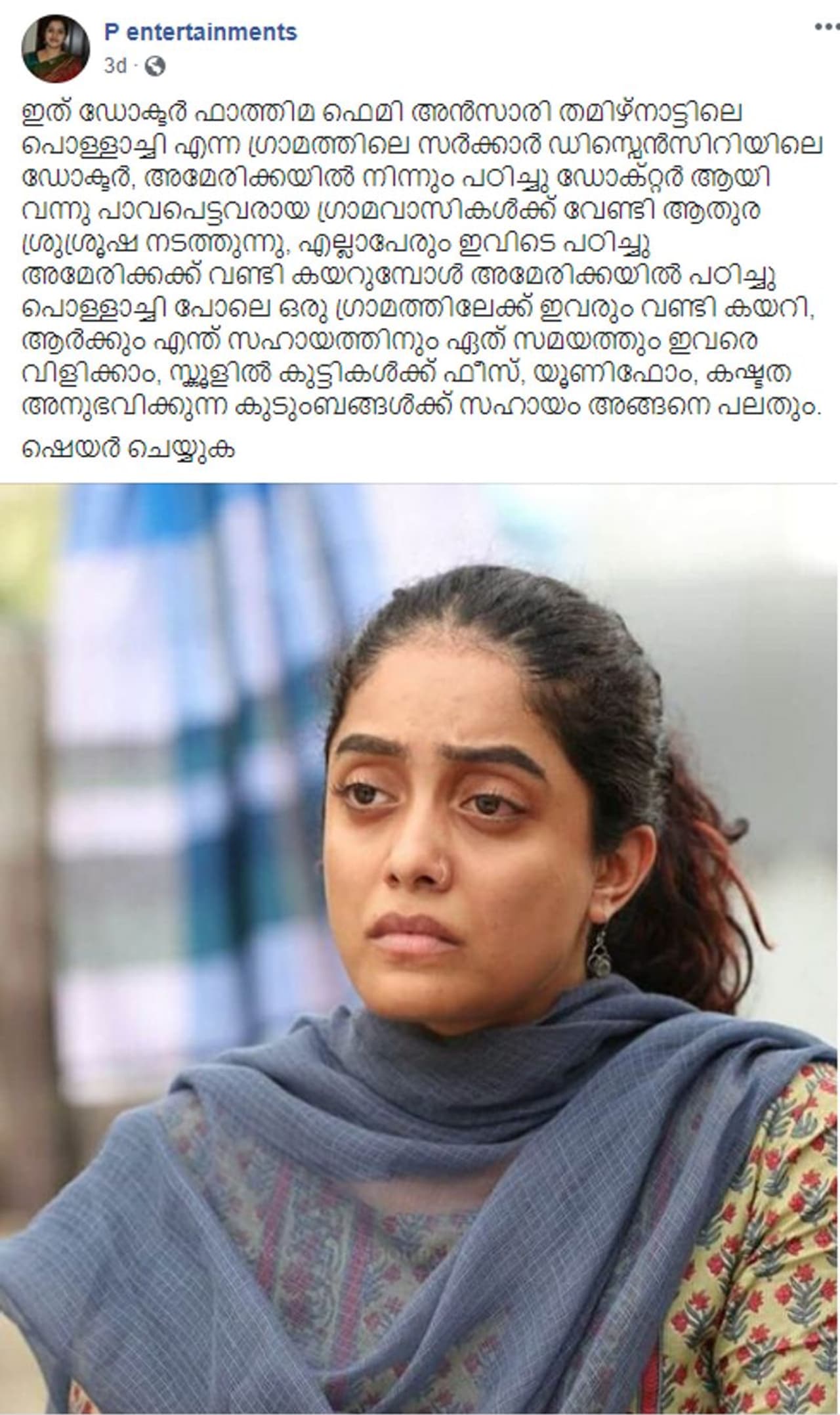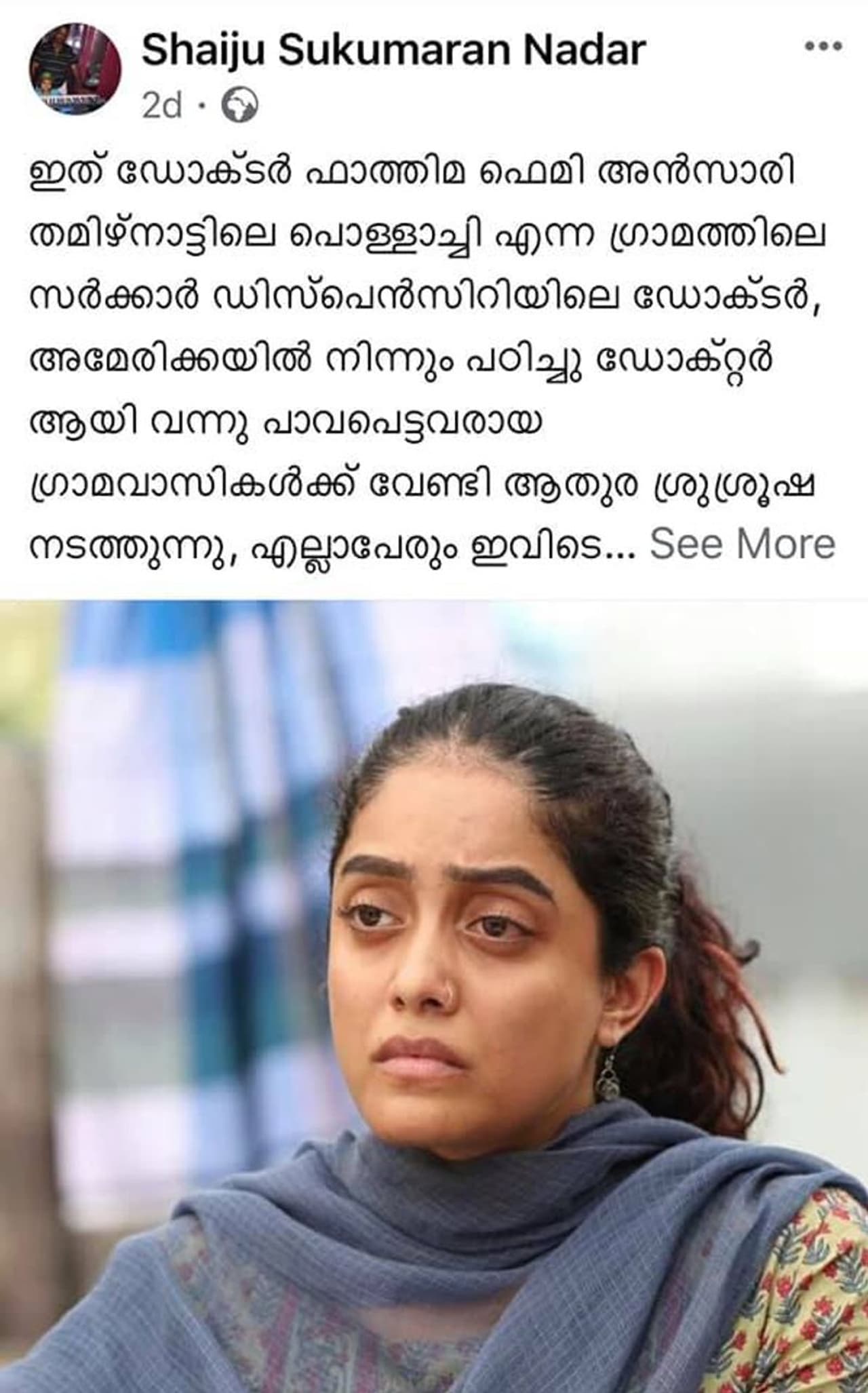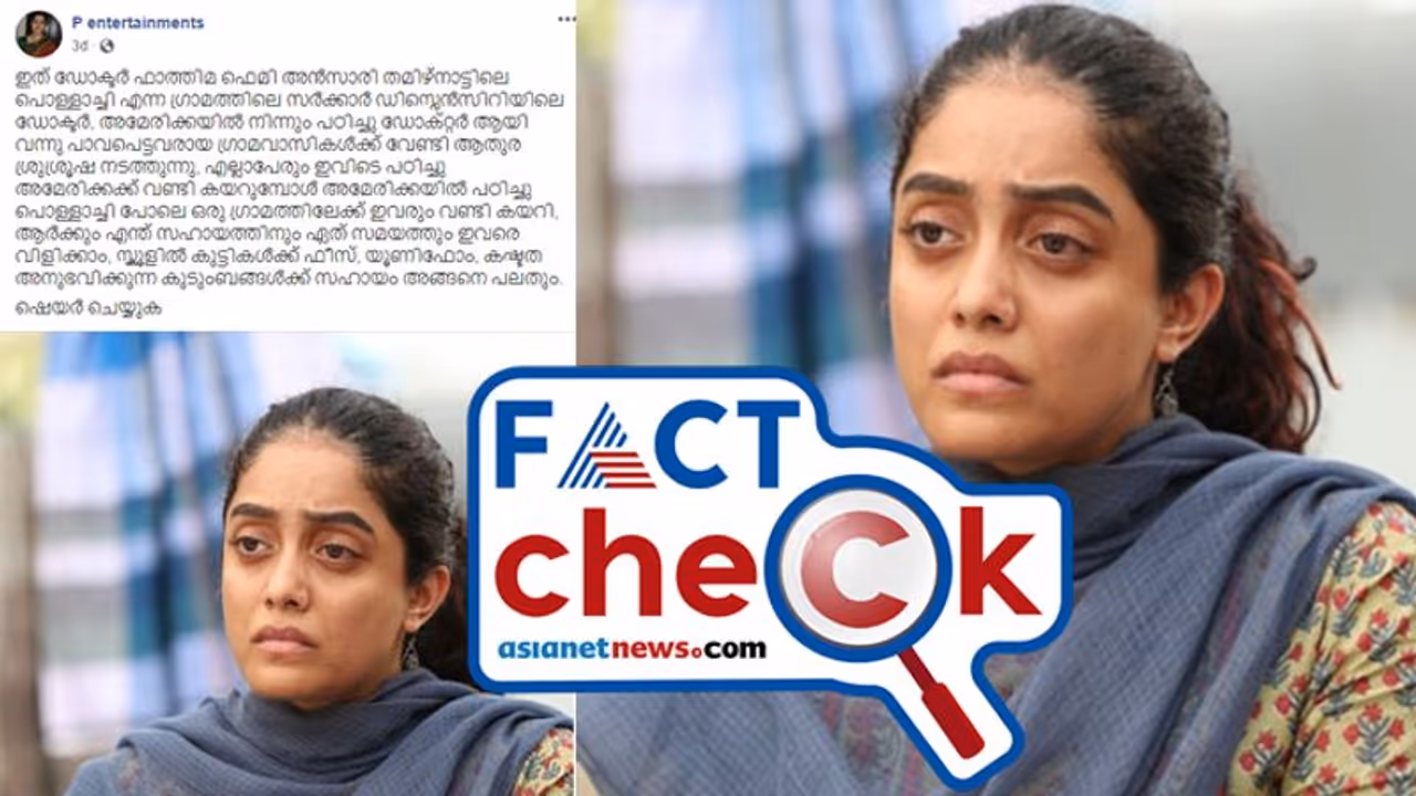 'അമേരിക്കയിൽനിന്ന് പഠിച്ചിട്ടും പൊള്ളാച്ചിയിലെ ഗ്രാമത്തില് പാവപെട്ടവരെ ശുശ്രൂഷിക്കുന്ന ഡോക്ടര്' എന്ന കുറിപ്പ് വ്യാജമാണ്. ഫേസ്ബുക്കിലെ പോസ്റ്റിനൊപ്പമുള്ള ചിത്രം തമിഴ് നടി അഭിരാമി വെങ്കടാചലത്തിന്റേതാണ്. നേര്ക്കൊണ്ട പാര്വൈ എന്ന തമിഴ് സിനിമയില് നിന്നുള്ള ചിത്രമാണിത്. ബിഗ് ബോസ് തമിഴ് പതിപ്പിലെ ശ്രദ്ധേയ മത്സരാര്ഥി കൂടിയായിരുന്നു അഭിരാമി വെങ്കടാചലം.