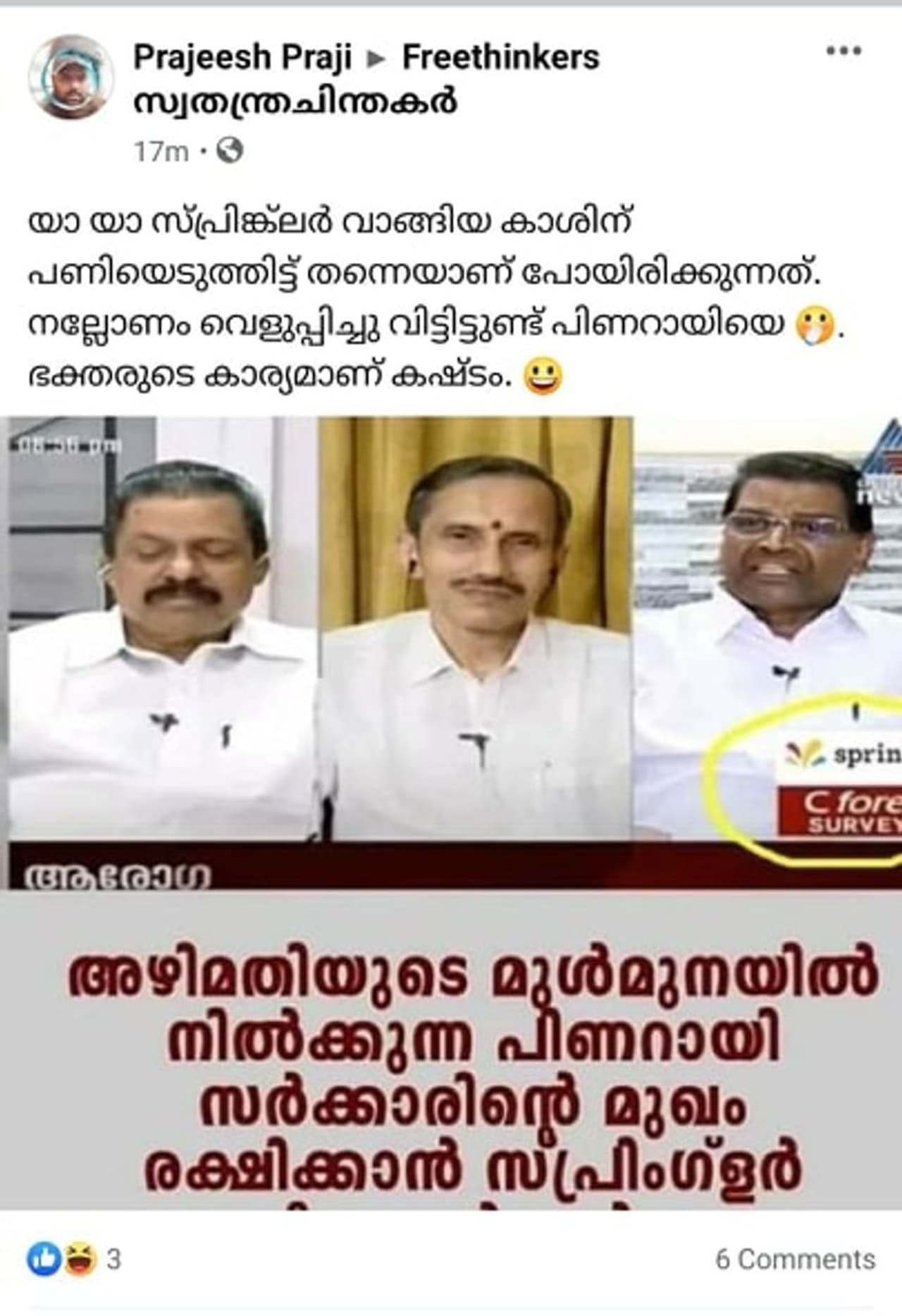 സീ ഫോര് സര്വെ എല്ഡിഎഫിന് അനുകൂലമായി ഫലം പ്രവചിച്ച പശ്ചാത്തലത്തിലാണ് ഈ പോസ്റ്റ് പ്രത്യക്ഷപ്പെട്ടത്