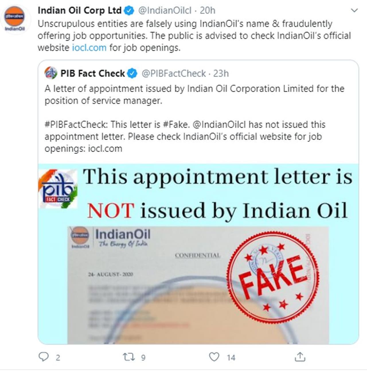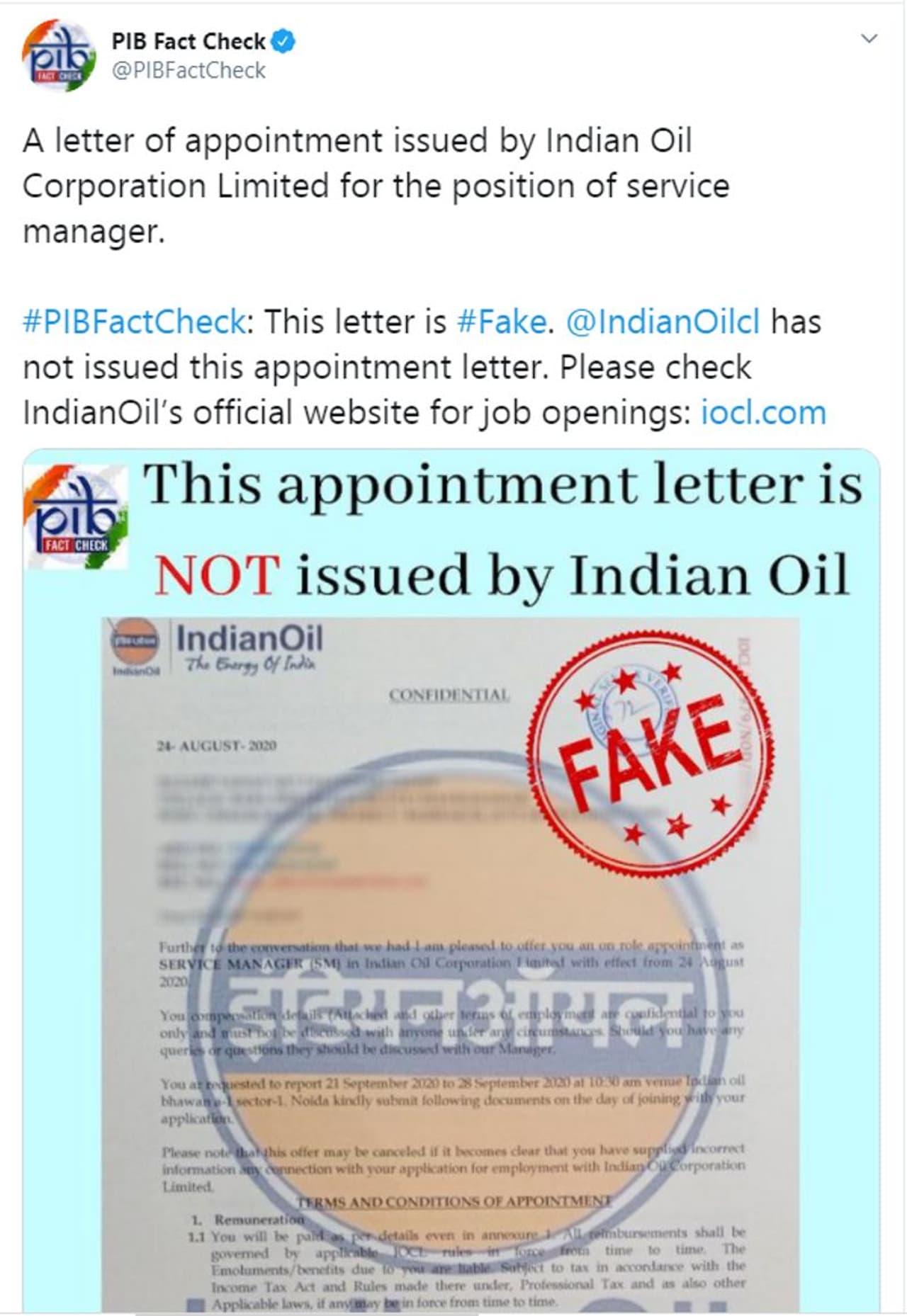 പ്രചരിക്കുന്നത് വ്യാജ സന്ദേശമാണ് എന്ന് ഇന്ത്യന് ഓയില് കോര്പ്പറേഷനും സ്ഥിരീകരിച്ചിട്ടുണ്ട്. ഓഗസ്റ്റ് 24ന് ഇത്തരമൊരു നിയമന ഉത്തരവ് ഐഒസി പുറത്തിറക്കിയിട്ടില്ല.