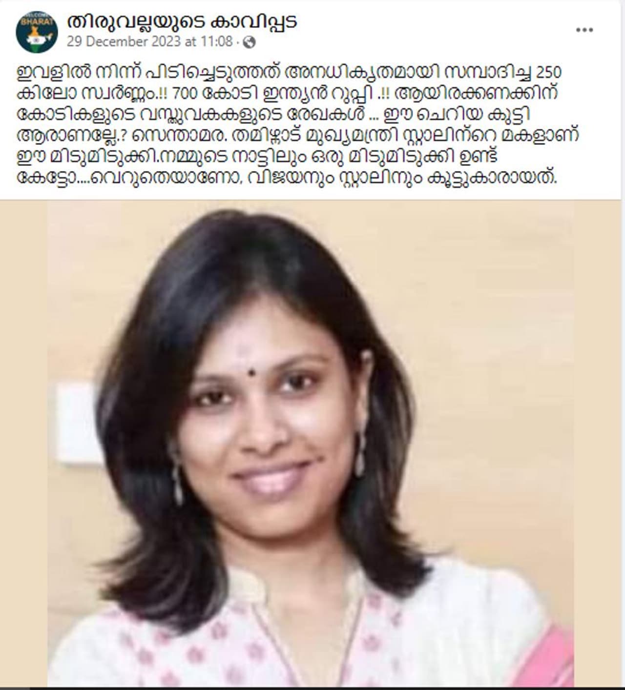 'ഇവളിൽ നിന്ന് പിടിച്ചെടുത്തത് അനധികൃതമായി സമ്പാദിച്ച 250 കിലോ സ്വർണ്ണം.!! 700 കോടി ഇന്ത്യൻ റുപ്പി .!! ആയിരക്കണക്കിന് കോടികളുടെ വസ്തുവകകളുടെ രേഖകൾ... ഈ ചെറിയ കുട്ടി ആരാണല്ലേ.? സെന്താമര. തമിഴ്നാട് മുഖ്യമന്ത്രി സ്റ്റാലിന്റെ മകളാണ് ഈ മിടുമിടുക്കി. നമ്മുടെ നാട്ടിലും ഒരു മിടുമിടുക്കി ഉണ്ട് കേട്ടോ... വെറുതെയാണോ, വിജയനും സ്റ്റാലിനും കൂട്ടുകാരായത്'. സെന്താമരൈയുടെ എന്നവകാശപ്പെടുന്ന ചിത്രം സഹിതമാണ് സോഷ്യല് മീഡിയ പോസ്റ്റ്.