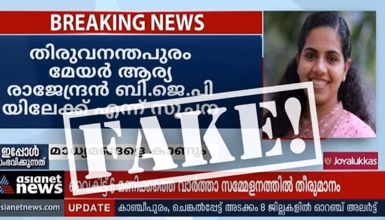 ബ്രേക്കിംഗ് ന്യൂസ്- 'തിരുവനന്തപുരം മേയര് ആര്യ രാജേന്ദ്രന് ബിജെപിയിലേക്ക് എന്ന് സൂചന' എന്ന തലക്കെട്ടിലാണ് വ്യാജ വാര്ത്ത പ്രചരിക്കുന്നത്