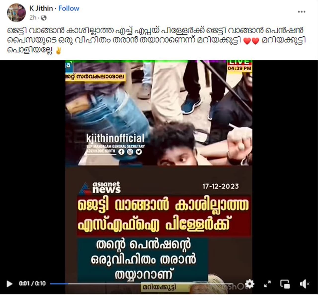 തിരുവനന്തപുരം: കേരളത്തിലെ സര്വകലാശാലകളുടെ ചാന്സലറും ഗവര്ണറുമായ ആരിഫ് മുഹമ്മദ് ഖാനെതിരെ എസ്എഫ്ഐ കാലിക്കറ്റ് സര്വകലാശാലയില് പ്രതിഷേധം തുടരുന്നതിനിടെ ഏഷ്യാനെറ്റ് ന്യൂസിന്റെ പേരില് വ്യാജ കാര്ഡ് പ്രചരിക്കുന്നു. 'ജെട്ടി വാങ്ങാന് കാശില്ലാത്ത എസ്എഫ്ഐ പിള്ളേര്ക്ക് തന്റെ പെന്ഷന്റെ ഒരു വിഹിതം തരാന് തയ്യാറാണ്' എന്ന് മറിയക്കുട്ടി പറഞ്ഞതായി ഏഷ്യാനെറ്റ് ന്യൂസ് 2023 ഡിസംബര് 17ന് കാര്ഡ് നല്കിയതായാണ് പ്രചാരണം. എന്നാല് ഇങ്ങനെയൊരു വാര്ത്തയോ കാര്ഡോ ഏഷ്യാനെറ്റ് ന്യൂസ് പ്രസിദ്ധീകരിച്ചിട്ടില്ല. ഏഷ്യാനെറ്റ് ന്യൂസിന്റെ സോഷ്യല് മീഡിയ പ്ലാറ്റ്ഫോമില് എവിടെയും ഇത്തരമൊരു കാര്ഡ് നല്കിയിട്ടില്ല എന്നറിയിക്കുന്നു.