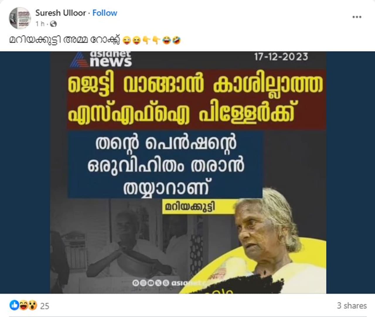 മറിയക്കുട്ടി പറഞ്ഞതായി സാമൂഹ്യമാധ്യമങ്ങളില് പ്രചരിക്കുന്ന കാര്ഡിലുള്ളത് ഏഷ്യാനെറ്റ് ന്യൂസിന്റെ ഫോണ്ട് അല്ല