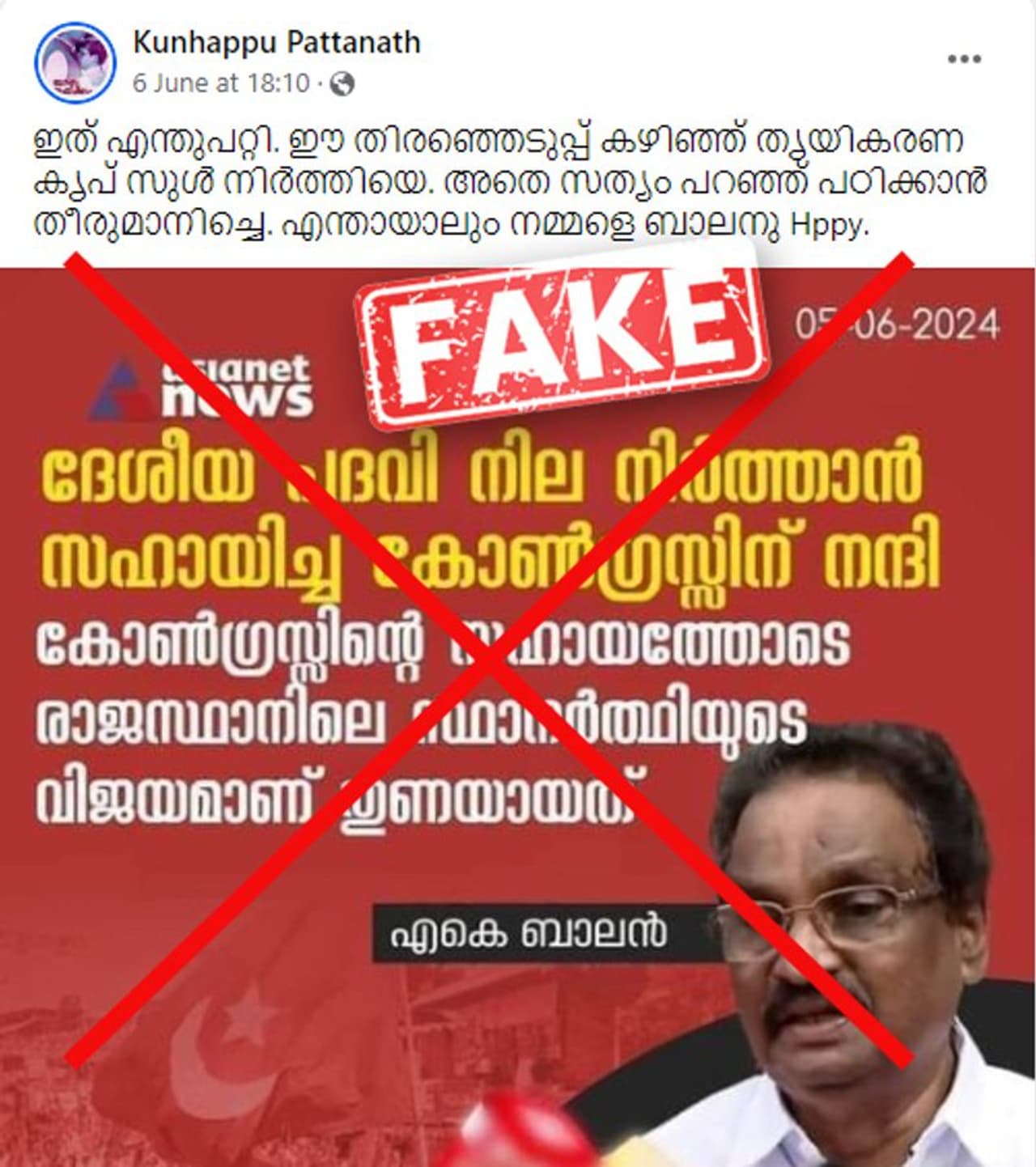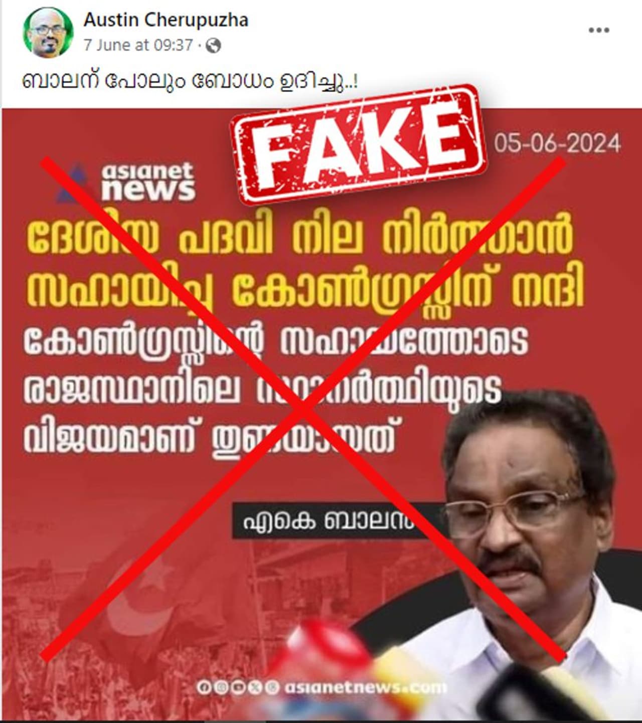 ഇത്തരത്തിലൊരു ന്യൂസ് കാര്ഡ് സിപിഎം നേതാവ് എ കെ ബാലന്റെ പ്രസ്താവനയായി ഏഷ്യാനെറ്റ് ന്യൂസ് പ്രസിദ്ധീകരിച്ചിട്ടില്ല എന്നറിയിക്കുന്നു