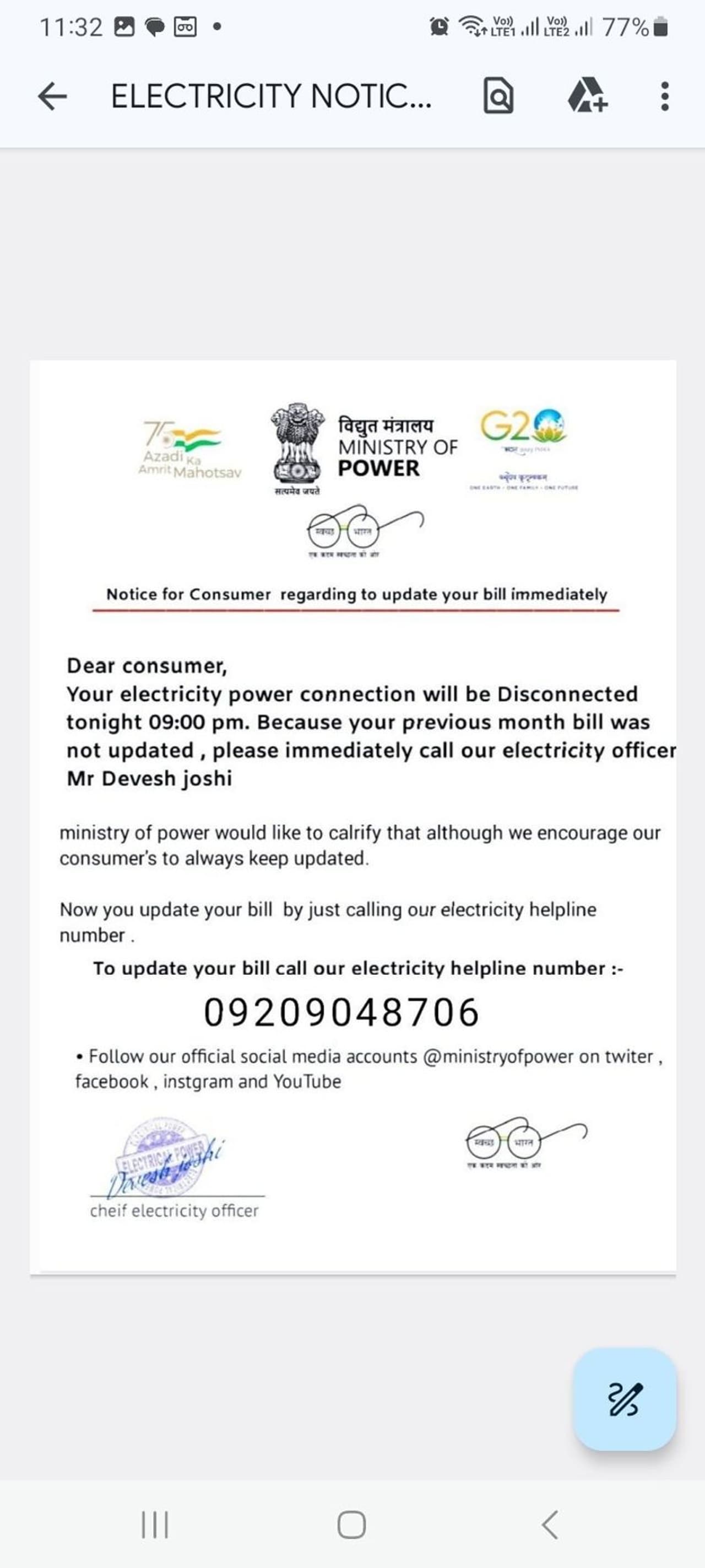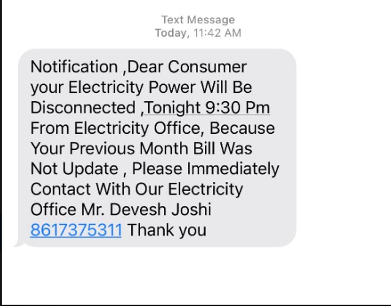 ബില് ഉടനടി അടച്ചില്ലെങ്കില് ഇന്ന് രാത്രി 9 മണിക്ക് നിങ്ങളുടെ വൈദ്യുതി കണക്ഷന് വിച്ഛേദിക്കും എന്നാണ് മെസേജില് പറയുന്നത്