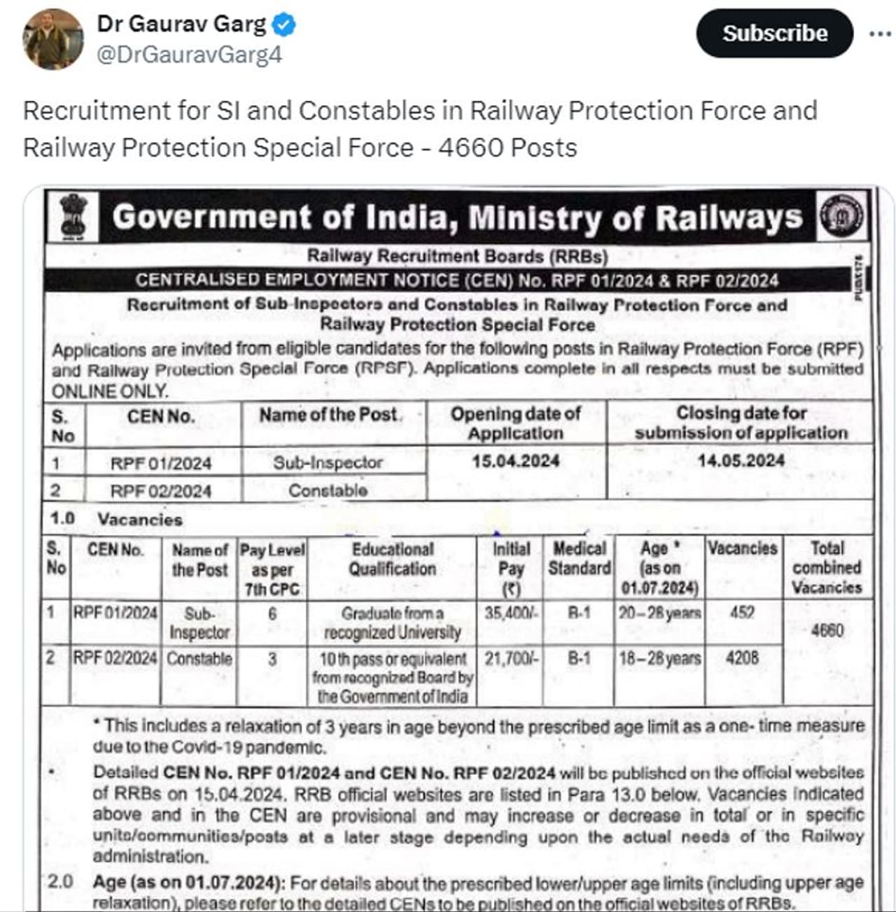 റെയില്വേ മന്ത്രാലയം പുറത്തിറക്കിയതായി പറഞ്ഞുകൊണ്ടുള്ള ഒരു നോട്ടീസാണ് സാമൂഹ്യമാധ്യമങ്ങളില് പ്രചരിക്കുന്നത്. റെയില്വേ സുരക്ഷാ സേനയില് സബ്-ഇന്സ്പെക്ടര്മാരുടെയും കോണ്സ്റ്റബിള്മാരുടേയും ഒഴിവുകളിലേക്ക് അപേക്ഷ ക്ഷണിച്ചിരിക്കുന്നു എന്നുപറഞ്ഞാണ് നോട്ടീസ്. ഒഴിവുകളുടെ എണ്ണവും അപേക്ഷിക്കേണ്ട തിയതിയും ശമ്പളവും പ്രായപരിധിയുമെല്ലാം ഈ സന്ദേശത്തില് നല്കിയിരിക്കുന്നതായി കാണാം.