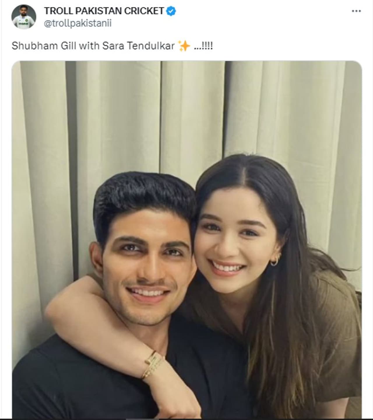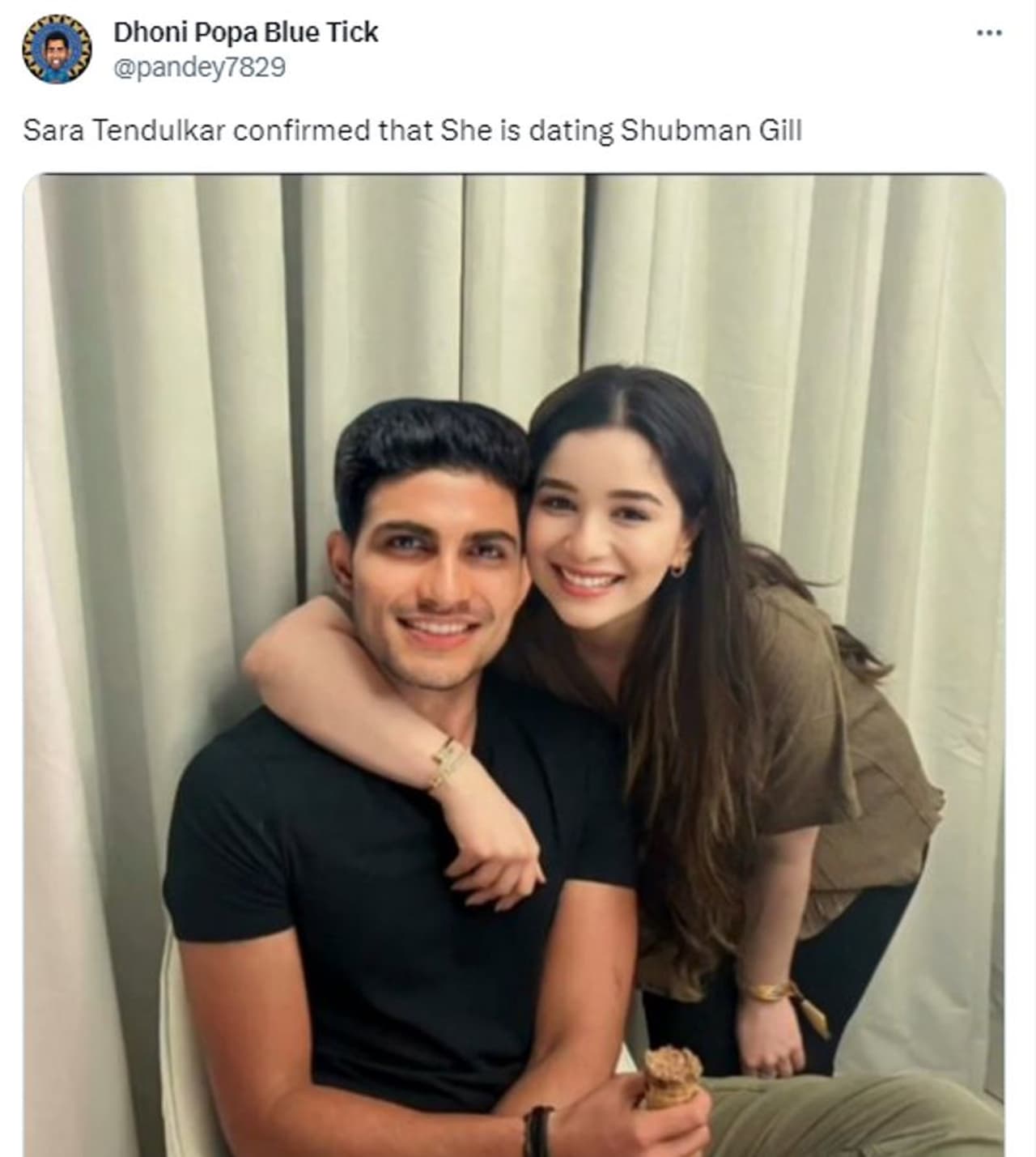 'ശുഭ്മാന് ഗില്ലിനെ ഡേറ്റ് ചെയ്യുന്നതായി സാറ ടെന്ഡുല്ക്കര് സ്ഥിരീകരിച്ചു' എന്ന തലക്കെട്ടോടെയാണ് ഗില്ലും സാറയും ചേര്ന്നുള്ള ചിത്രം Dhoni Popa Blue Tick എന്ന അക്കൗണ്ടില് നിന്ന് ട്വീറ്റ് ചെയ്തിരിക്കുന്നത്. ഗില് കസേരയില് ഇരിക്കുന്നതായും സാറ തോളില് കയ്യിട്ട് അരികില് നില്ക്കുന്നതുമായാണ് ചിത്രം. ഇരുവരും ഫോട്ടോയ്ക്ക് പോസ് ചെയ്യുകയായിരുന്നു എന്ന് ഒറ്റ നോട്ടത്തില് വ്യക്തമാണ്. ഇതേ ചിത്രം ട്രോള് പാകിസ്ഥാന് ക്രിക്കറ്റ് എന്ന യൂസറും ട്വീറ്റ് ചെയ്തിരിക്കുന്നത് കാണാം. മറ്റ് നിരവധിയാളുകളും സാറയും ഗില്ലുമുള്ള ചിത്രം സാമൂഹ്യമാധ്യമങ്ങളില് പങ്കുവെച്ചിട്ടുണ്ട്.