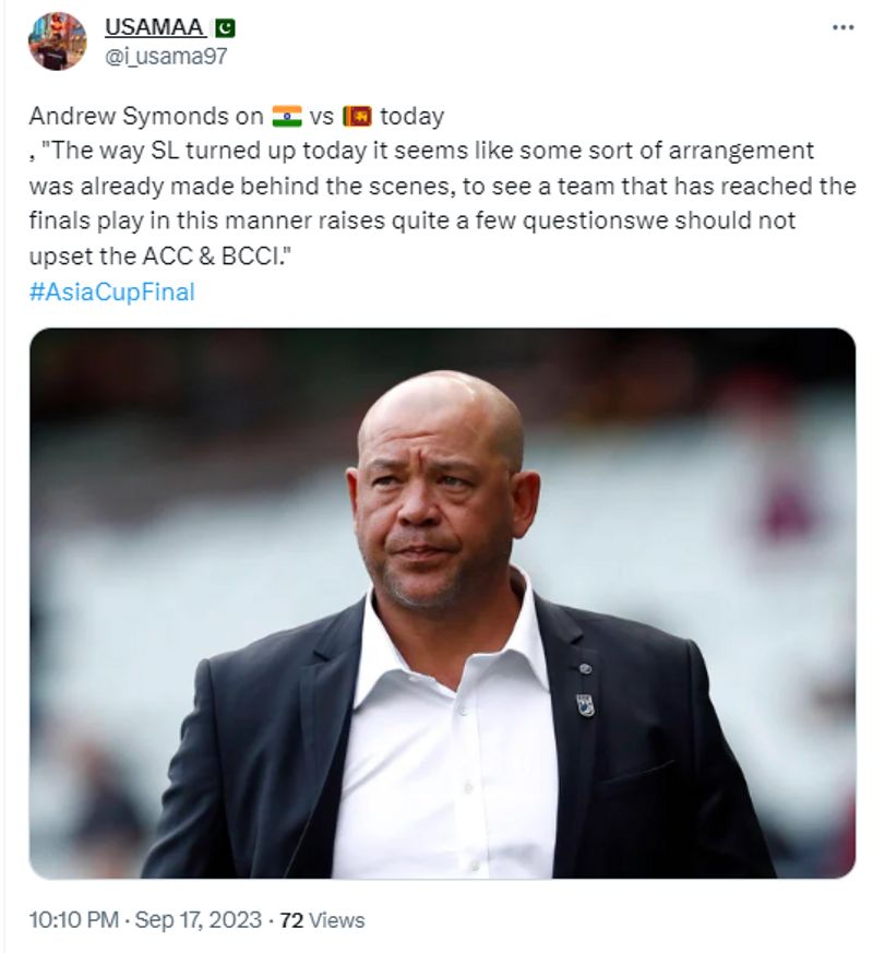 എന്നാല് ഇങ്ങനെയൊരു സംഭവത്തിനേ സാധ്യതയില്ല എന്ന് എല്ലാവര്ക്കും അറിയാവുന്ന കാര്യമാണ്. കാരണം, 2022 മെയ് 14ന് ക്വിന്സ്ലന്ഡില് വച്ചുണ്ടായ കാറപകടത്തില് ആന്ഡ്രൂ സൈമണ്ട്സ് അന്തരിച്ചിരുന്നു. സൈമണ്ട്സിന്റെ നിര്യാണ വാര്ത്ത അന്ന് ഏഷ്യാനെറ്റ് ന്യൂസ് ഓണ്ലൈന് ഉള്പ്പടെ പ്രസിദ്ധീകരിച്ചിരുന്നു. ആന്ഡ്രൂ സൈമണ്ട്സ് പറഞ്ഞതായി മാത്രമല്ല, അന്തരിച്ച മറ്റ് ഓസീസ് മുന് താരങ്ങളായ ഷെയ്ന് വോണും ഫിലിപ് ഹ്യൂസും പറഞ്ഞതായും ഈ വാചകങ്ങള് വച്ച് സാമൂഹ്യമാധ്യമങ്ങളില് പ്രചാരണം കാണാം. ഇതിനാല്തന്നെ കരുതിക്കൂട്ടിയുള്ള വ്യാജ പ്രചാരണമാണ് നടക്കുന്നത് എന്ന് വ്യക്തം. കൊളംബോയില് നടന്ന ഏഷ്യാ കപ്പ് ക്രിക്കറ്റ് ടൂര്ണമെന്റ് ഫൈനലില് ആദ്യം ബാറ്റ് ചെയ്ത ലങ്ക 15.2 ഓവറില് 50 റണ്സില് പുറത്തായപ്പോള് ഇന്ത്യ 6.1 ഓവറില് 51 റണ്സുമായി 10 വിക്കറ്റിന്റെ ത്രില്ലര് ജയം സ്വന്തമാക്കിയിരുന്നു. ലങ്ക വെറും 50 റണ്ണില് പുറത്തായതോടെയാണ് വ്യാജ പ്രചാരണം ഉടലെടുത്തത്.