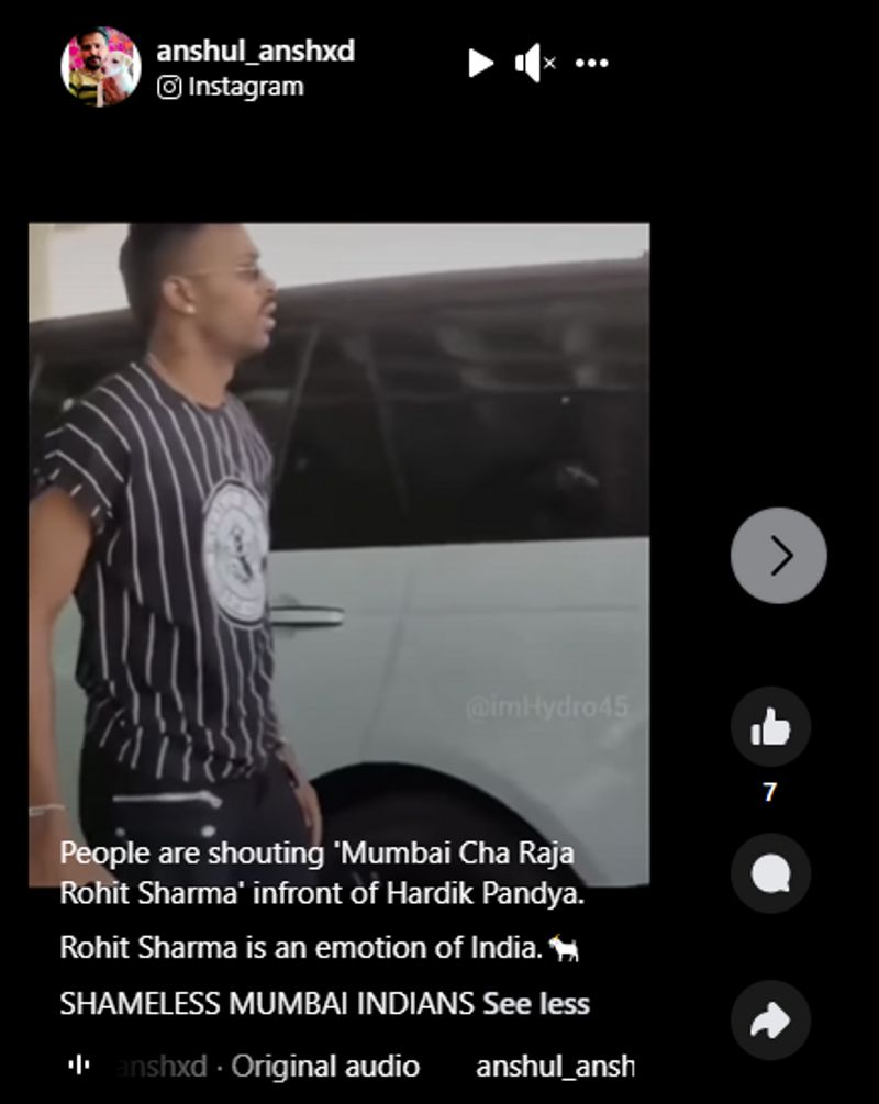 'രോഹിത് ശര്മ്മ മുംബൈയുടെ രാജാവാണ്, ഹാര്ദിക് പാണ്ഡ്യക്ക് മുന്നില് ആരാധകര് രോഹിത് ശര്മ്മയുടെ പേര് ആവേശത്തോടെ വിളിക്കുന്നു. രോഹിത് ഇന്ത്യക്ക് വൈകാരികമായ പേരാണ്. പക്ഷേ മുംബൈ ഇന്ത്യന്സിന് ഉളുപ്പില്ല' എന്നിങ്ങനെയുള്ള കുറിപ്പോടെയാണ് ഹാര്ദിക് മുംബൈ വിമാനത്താവളത്തില് വരുന്നതിന്റെ വീഡിയോ റീല്സായി അപ്ലോഡ് ചെയ്തിരിക്കുന്നത്. എന്താണ് ഇതിന്റെ വസ്തുത എന്ന് നോക്കാം.