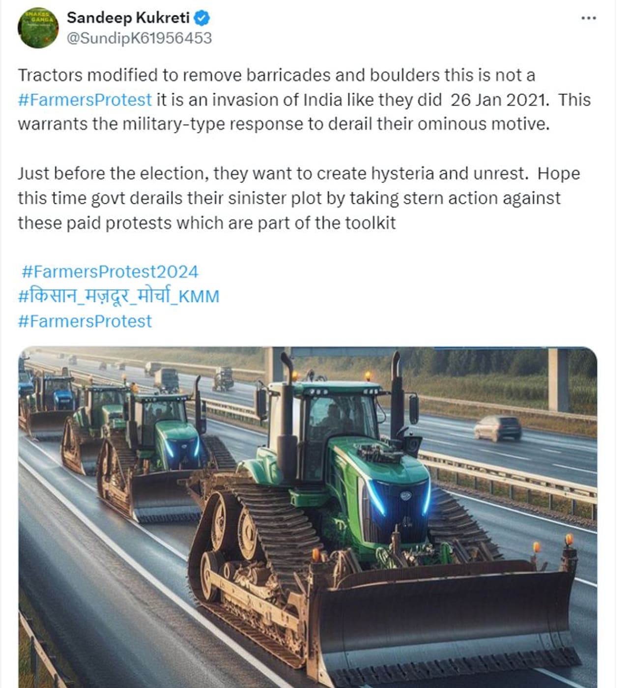 ബുള്ഡോസറുകളോട് സാമ്യമുള്ള അത്യാധുനിക വാഹനങ്ങള് റോഡിലൂടെ പോകുന്ന ചിത്രമാണ് ട്വീറ്റ് ചെയ്തിരിക്കുന്നത്. ബാരിക്കേഡുകള് നീക്കം ചെയ്യാന് കഴിയുന്ന ട്രാക്ടറുകളാണിത്. 'ഇത് കർഷകരുടെ സമരമല്ല, 2021 ജനുവരി 26ന് കണ്ടത് പോലൊരു അധിനിവേശമാണ്. തെരഞ്ഞെടുപ്പിന് തൊട്ടുമുമ്പ് രാജ്യത്ത് അസ്ഥിരത സൃഷ്ടിക്കാനുള്ള നീക്കം. ഇത്തവണ സമരക്കാരുടെ നീക്കം സർക്കാർ പൊളിക്കുമെന്ന് പ്രതീക്ഷിക്കുന്നു' എന്നുമുള്ള കുറിപ്പോടെയാണ് 2024 ഫെബ്രുവരി 13ന് ചിത്രം പോസ്റ്റ് ചെയ്തിരിക്കുന്നത്.