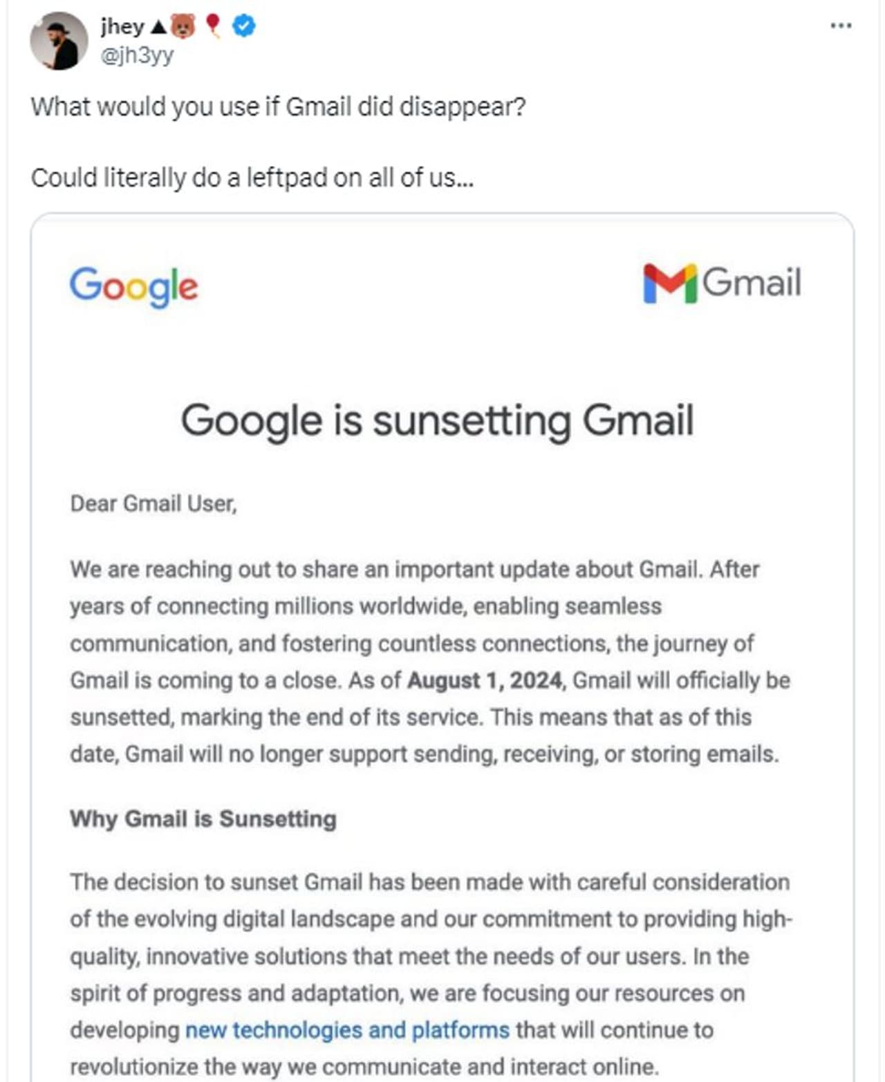 എന്നാല് ജിമെയില് സേവനം പൂര്ണമായും ഗൂഗിള് അവസാനിപ്പിക്കുന്നതായുള്ള പ്രചാരണം തെറ്റാണ്. ജിമെയില് ഇവിടെ തുടര്ന്നും കാണുമെന്ന് സേവനദാതാക്കള് തന്നെ എക്സിലൂടെ (പഴയ ട്വിറ്റര്) അറിയിച്ചിട്ടുണ്ട്. ജിമെയില് പൂട്ടുന്നതായുള്ള പ്രചാരണം ഗൂഗിള് നിഷേധിച്ചതായി പ്രമുഖ അന്താരാഷ്ട്ര മാധ്യമമായ ബിബിസി റിപ്പോര്ട്ട് ചെയ്തിട്ടുമുണ്ട്.